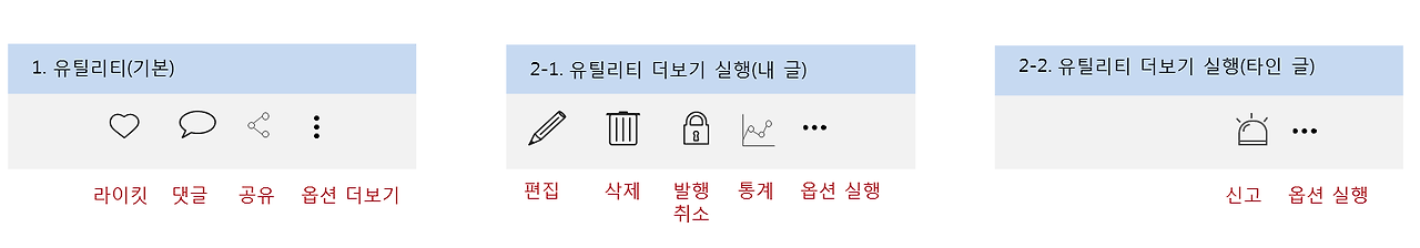 게시글과 관련된 기능들은 우측 상단에 유틸리티 영역에 밀집시켰다. 상시 노출되는 기능은 '라이킷', '댓글', '공유' 그리고 '옵션 더보기' 아이콘이며, '옵션 더보기' 버튼 클릭 시 작성자 여부를 확인하여 '편집', '삭제' 등의 기능이 표시된 버전과 문제가 있는 글을 '신고'를 할 수 있는 버전으로 분류된다.