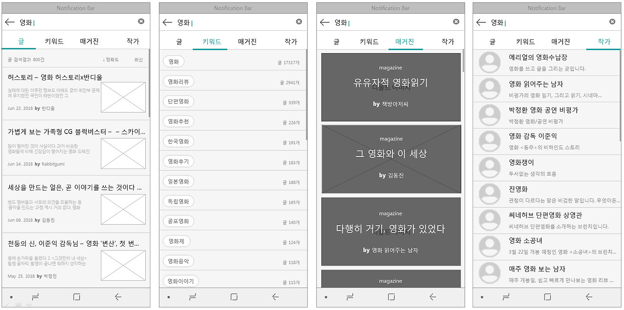 PC와 달리 모바일에서는 UI가 조금 다르게 구성되어져 있다. 글쓰기 버튼을 drawer에 넣어버렸고, 검색 버튼을 선택하면 검색어 입력 화면으로 화면이동을 하게 된다. 검색어를 입력하기 전 텍스트 필드 창에는 플레이스홀더(Placeholder Text)를 제공하고, 하단에 최근 검색어 리스트를 보여준다. 키워드를 key-in 하면 하단에 글/매거진/작가 탭이 생성되고, 입력한 키워드 내용에 맞춰 실시간 검색된 결과를 노출한다.