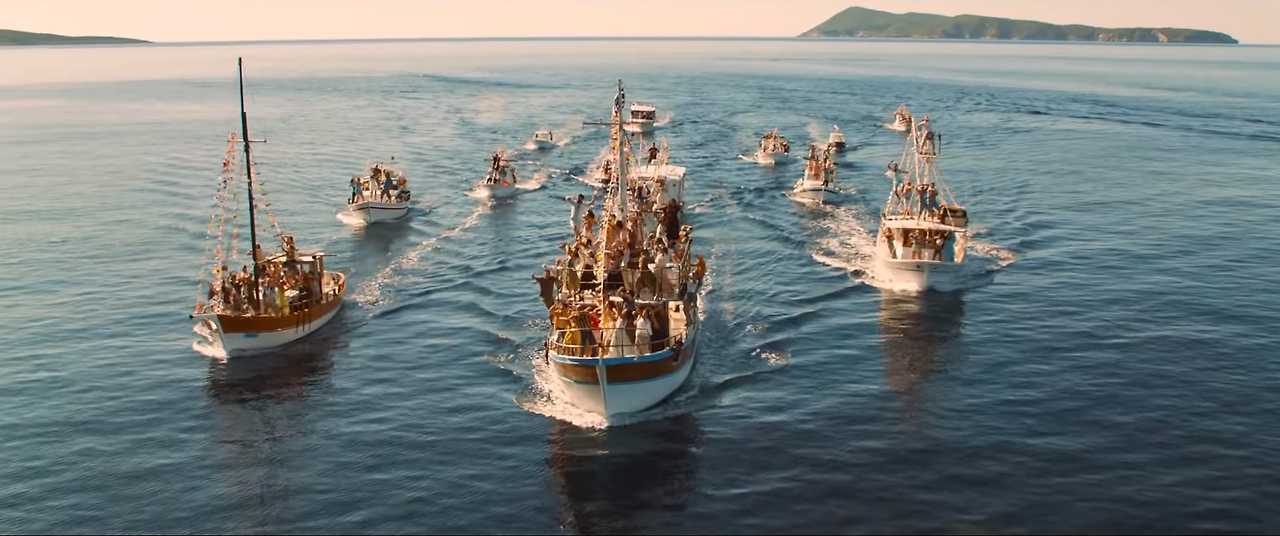 영화는 다시 현재를 배경으로 돌아가게 된다. 폭우로 비행기가 결항되어 축하파티에 오기로 약조된 인사들이 줄이어 취소를 하게 된다. 소피는 재개장 파티를 실패했다며 낙심할 때, 비즈니스 계약 건으로 불참할 해리(콜린 퍼스 님)와 수상소감 발표로 불참할 빌(스텔란 스카스가드 님)이 바다로 나가지 못하는 뱃사람들을 모아 섬으로 들어온다. 경쾌한 Dancing Queen 음악과 함께 화려한 군무가 보는 이들의 눈과 귀를 즐겁게 해준다.