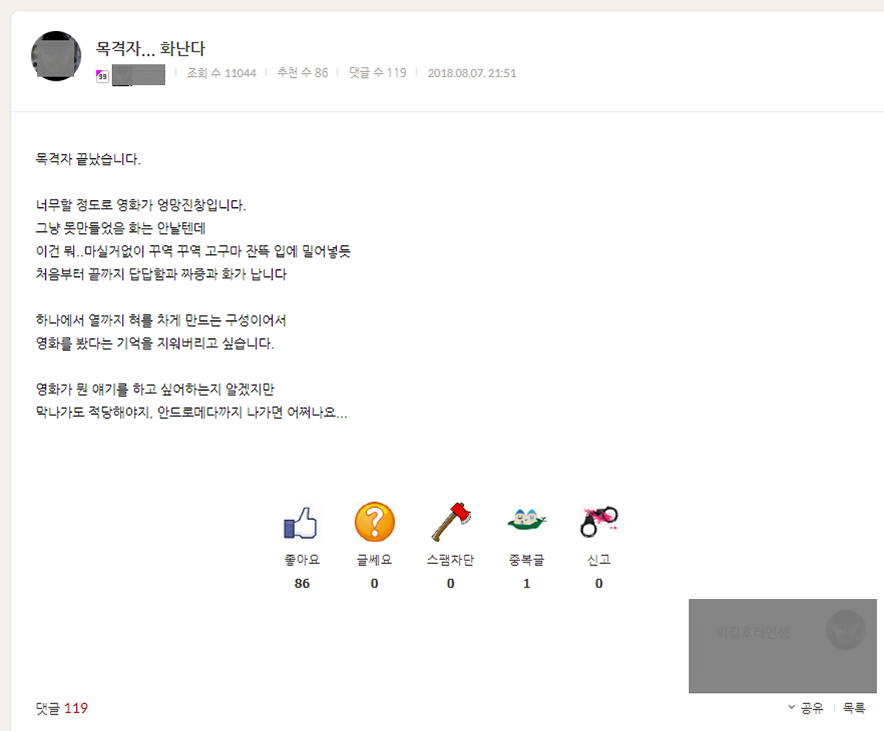 앞서 진행된(8/7) 시사회에서 부정적인 리뷰가 많았기에 대응의 필요했을 것이다. 개봉도 하기 전에 부정적인 리뷰로 날개를 펴보지도 못할 것을 우려한 감독과 배우의 힘든 발걸음이었다. 시사회를 찾은 관객들 손을 붙잡고 일일이 악수하는 세리머니는 매우 인상 깊었다. 그들의 진심 어린 노려이 영화 목격자에 대한 즐거운 기억을 갖고 집으로 향하게 만들어주었다.