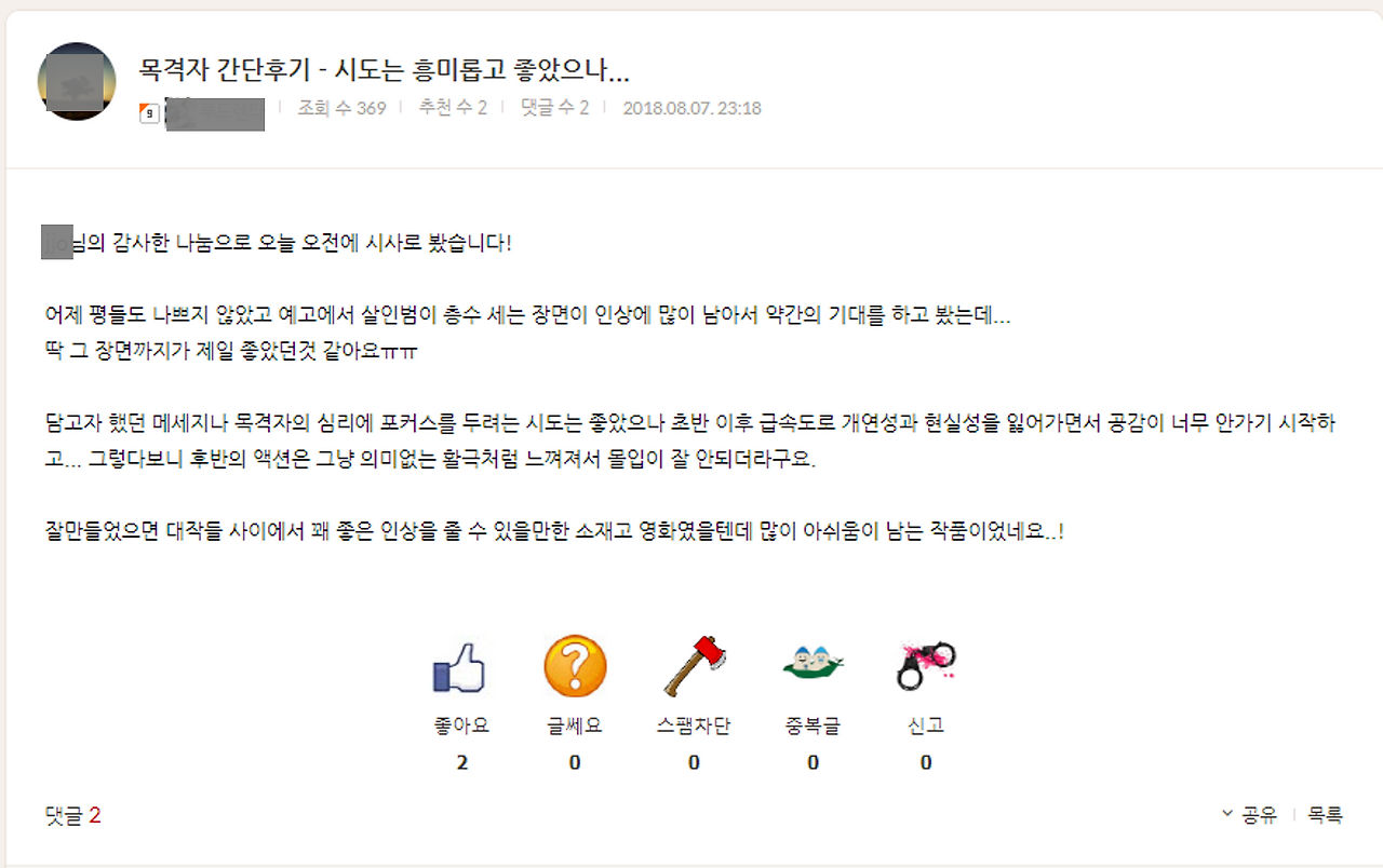 여름 더위를 식혀주는 스릴러 영화로서 소재는 참 좋았다. 스릴러 영화의 성공작으로 뽑히는 나홍진 감독의 '추격자', '곡성', '황해' 등과 비교했을 때, 관객들이 숨을 참고 몰입할 수 있게 하는 장면이 적었다.