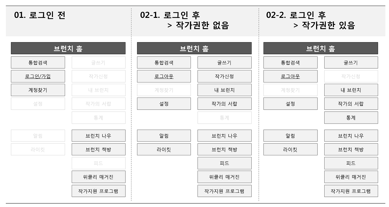 로그인 전/후, 작가권한 여부에 따라 메뉴는 아래와 같이 노출된다.