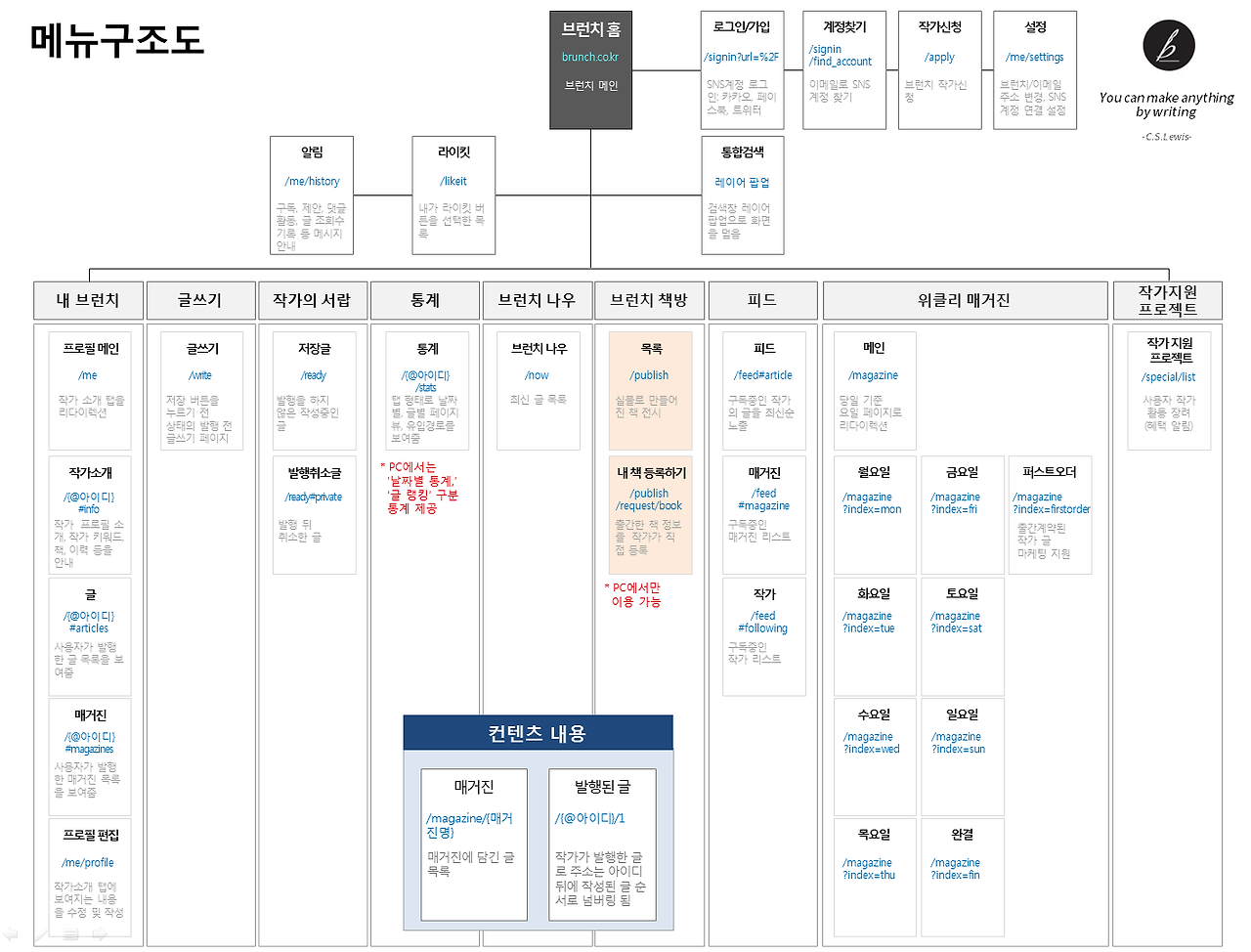 이번엔 햄버거 메뉴 버튼 안에 숨어있는 브런치의 메뉴를 살펴보자. 드로어에 담겨있는 메뉴로 구분하면 글쓰기, 작가의 서랍, 통계, 브런치 홈, 브런치 나우, 브런치 책방, 피드, 위클리 매거진, 작가지원 프로젝트로 분류된다. 각 페이지별 주소를 분석해보면, personality에 대한 페이지는 '/me' 또는 '@아이디'로 분류되어 만들어졌다.