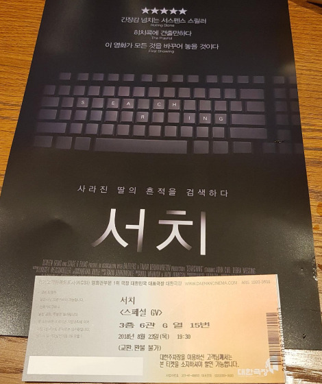 기존에 봐왔던 영화들과는 확연하게 다른 방식으로 영화를 구성하였다. 영화를 보고 돌아오는 길에 지금 느끼는 이 감정을 잊지 않기 위해 입을 다물고 장면 장면을 꼽씹으며 집으로 향했다. 그렇게 '서치뽕'을 맞고 집에 돌아와 리뷰를 적는 이 순간도 영화가 주는 신선한 충격이 가시지 않는다. 영화를 보고 나오는 관객들은 필자가 과한 평가를 한 것이 아님을 공감할 것이라 자부한다.