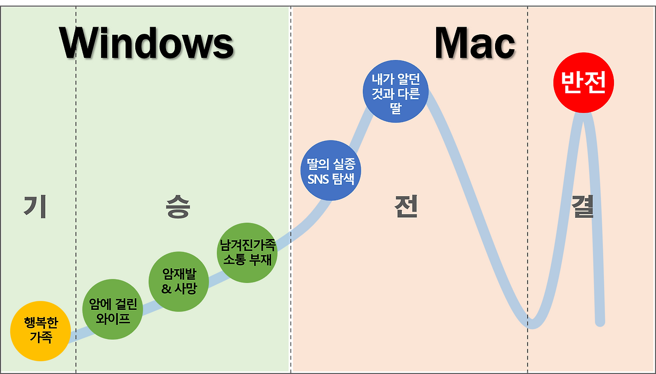 영화 서치의 이야기 구성은 단순하다. CF 광고를 보는 것 같은 행복한 가족생활을 보여주는 데이빗(존 조 님)은 와이프를 암으로 잃고 하나 뿐인 딸과 소통하지 않는 어색한 사이가 된다. 그러다 학교 과제로 외박을 하겠다는 딸 마고(미셸 라 님)는 아무리 연락을 취해도 답이 없다. 단순 가출이 아닌 딸의 신변에 문제가 생겼다고 여긴 데이빗은 경찰에 신고하고 딸의 SNS 계정을 뒤지며 실종된 딸의 발자취를 쫓는다. 비공개로 설정된 SNS 계정을 하나 둘 살피며, 자신이 알던 딸의 다른 면에 대해 알아가게 된다. 실종된 딸을 찾으며(searching, 영화 영어 타이틀) 둘 사이의 소통의 부재를 발견하는 이야기이다.