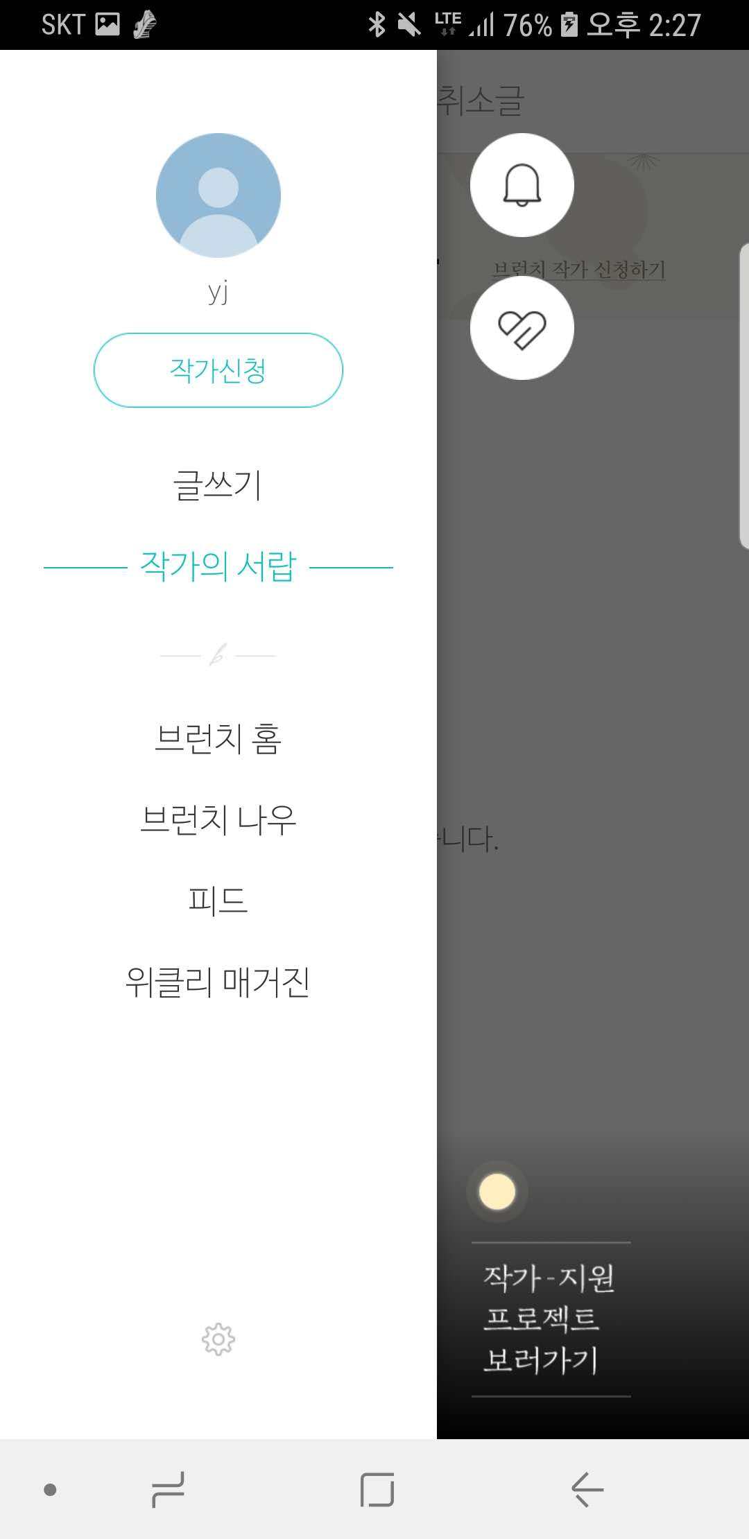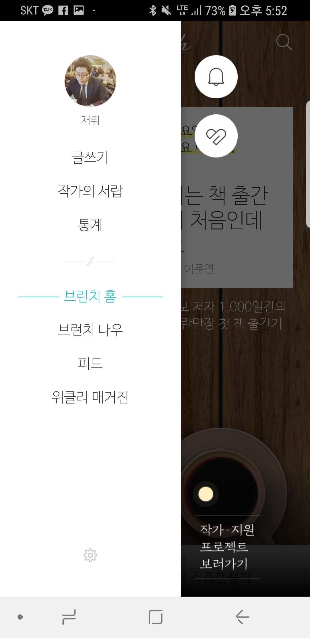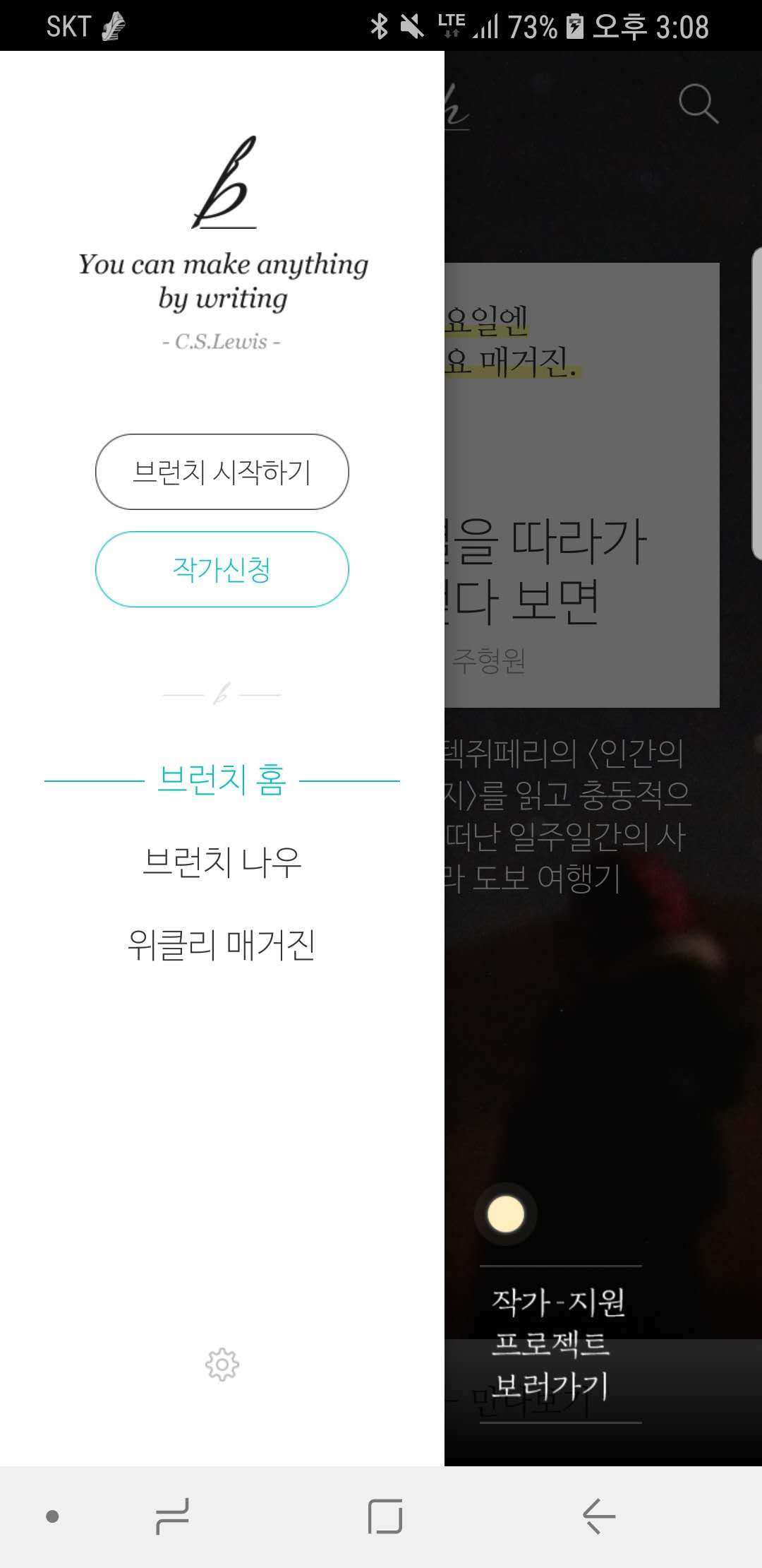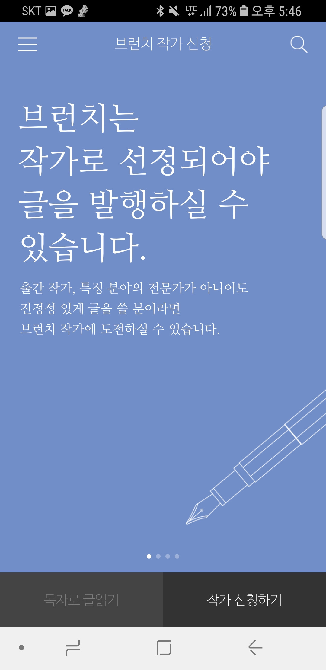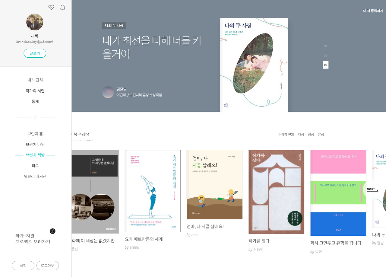 셋째, 사용자들이 글쓰기에 대한 심적 부담을 덜도록 곳곳에 작가 지원을 권장하는 기능이 표시되어 있다. 브런치 콘텐츠를 읽는 독자에서 작가로 전향할 수 있도록 사이드 메뉴 최상단 영역에 '작가신청' 버튼을 배치시켰다. 브런치에서 신인 작가를 발굴, 양성하는데 얼마나 많은 관심을 쏟고 있는지를 보여준다.
