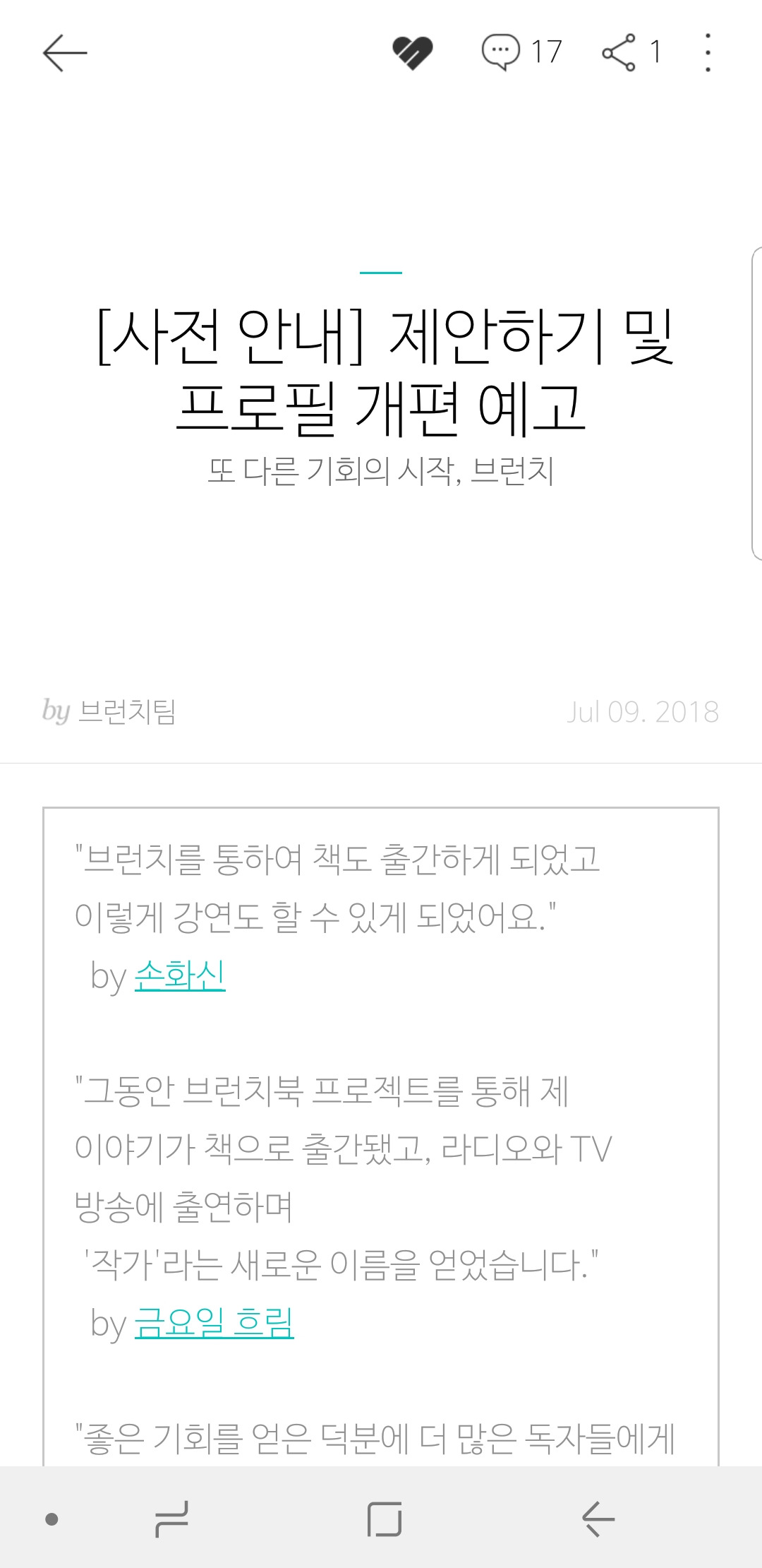 반면 모바일은 PC와 비교했을 때, 관심작가의 글이 업데이트되면 푸시가 오고, 아직 관심작가를 등록하지 않은 경우, 글 하단에 관심작가 등록을 권장하는 토스트 안내 메시지가 나타난다. 브런치 홈에서 위아래로 스와이핑하면 글 목록이 나타나고, 관심있는 타이틀 화면을 터치하거나 우측으로 밀어내면 상세페이지로 화면이동한다. 오밀조밀하게 기능을 많이 넣기 보다는 아이콘으로 시각화시킨 버튼을 화면 최상단 유틸리티 영역에 배치시켰다. 나머지 영역은 작가의 영역인 것으로 어림짐작할 수 있다.