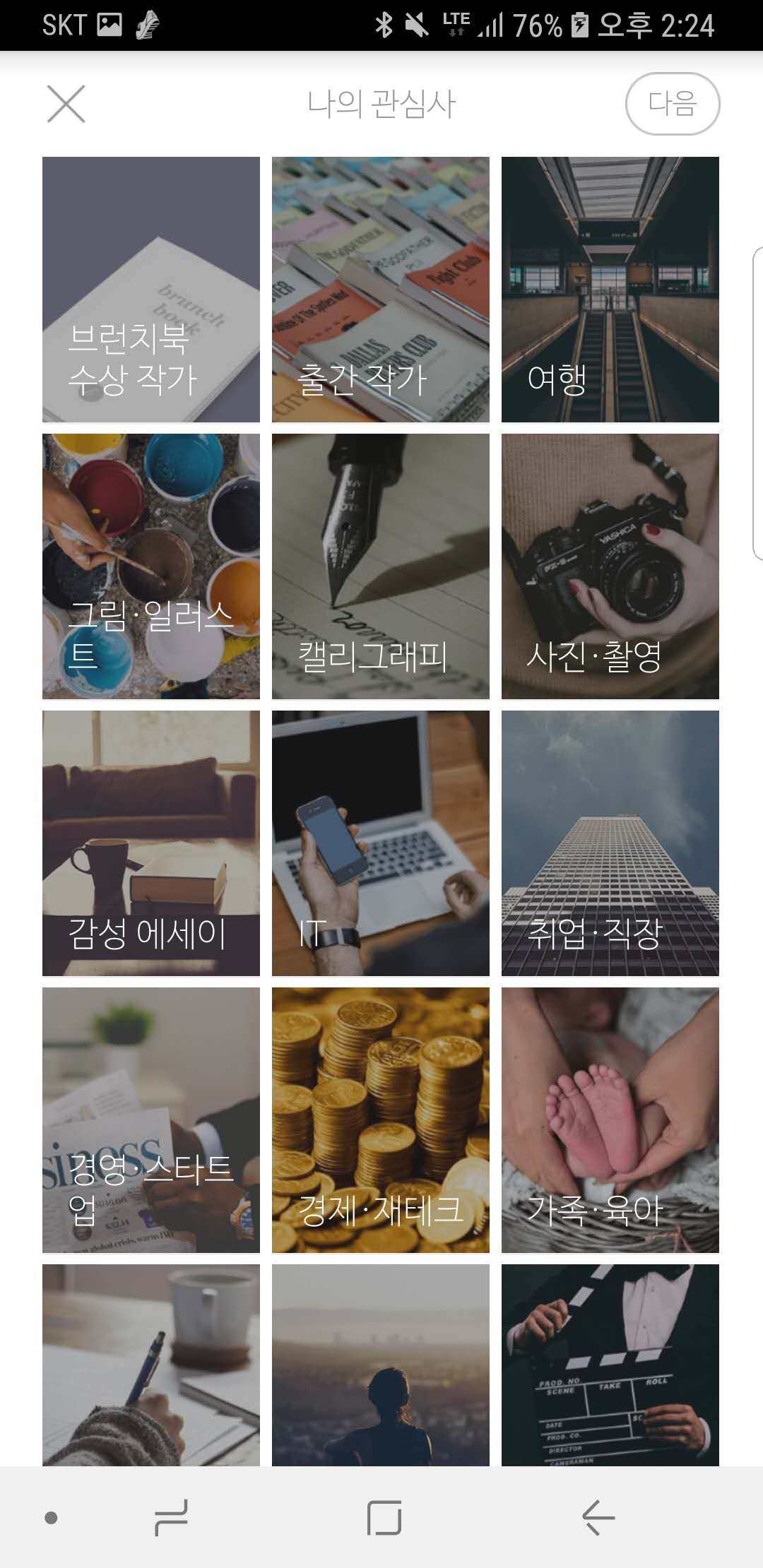 둘째, 사용자의 관심분야에 맞는 큐레이션 서비스를 제공한다. 브런치 서비스는 비회원일 경우에도 콘텐츠를 이용할 수 있으나, 회원에게는 회원가입 단계에서 설정한 관심분야에 맞춰 사용자에게 맞춤형으로 서비스를 제공한다. 회원가입도 새로 정보를 입력하는 방법이 아닌 SNS 계정과 API 연동하는 방식을 사용했다. 사용자들이 브런치 서비스 이용자로 전환되는 마음의 짐을 쉽게 덜어낸 것이다.