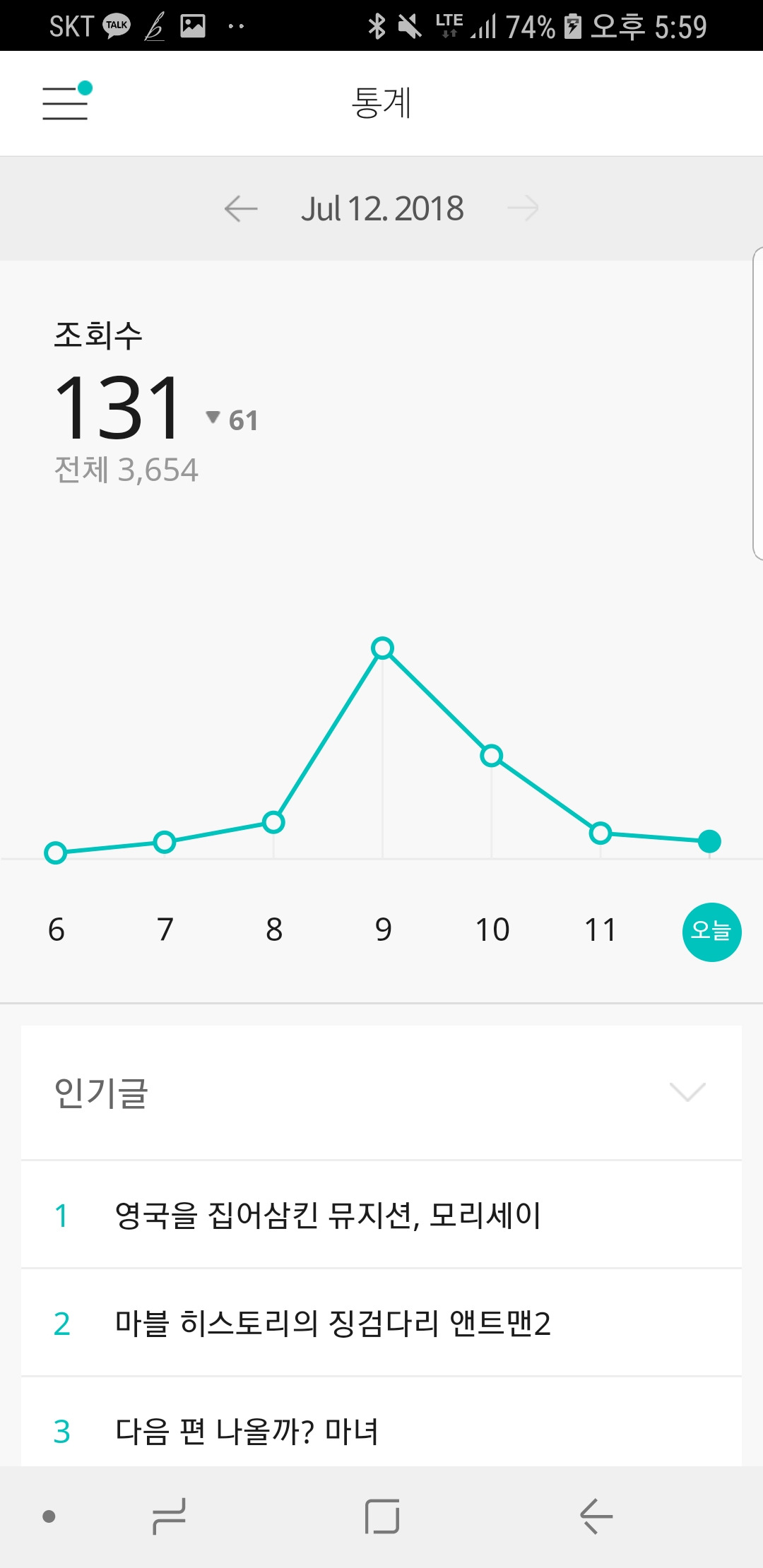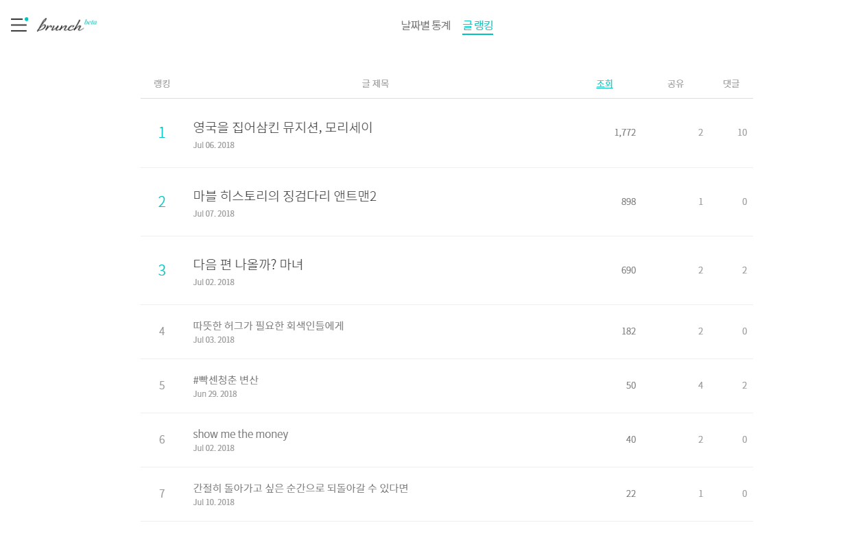 넷째, 브런치 유저가 작가신청 후, 심사를 거쳐 소비자에서 생산자로 변경됨에 따라 사이드 메뉴에 '통계'라는 기능을 별도 제공한다. 조회수, SNS 공유수, 댓글 수와 같이 아주 기초적인 통계 기능을 제공할 뿐이나, 내가 발행한 글을 찾는 사람들의 일별/주별/월별 현황을 체크할 수 있다는 점에서 작가들이 자발적으로 이어 글을 쓰게 만든다. 새로운 정보, 노하우, 통찰 등을 브런치에 적으며, 새 글의 조회수와 댓글 수에 만족하며 지내게 된다.