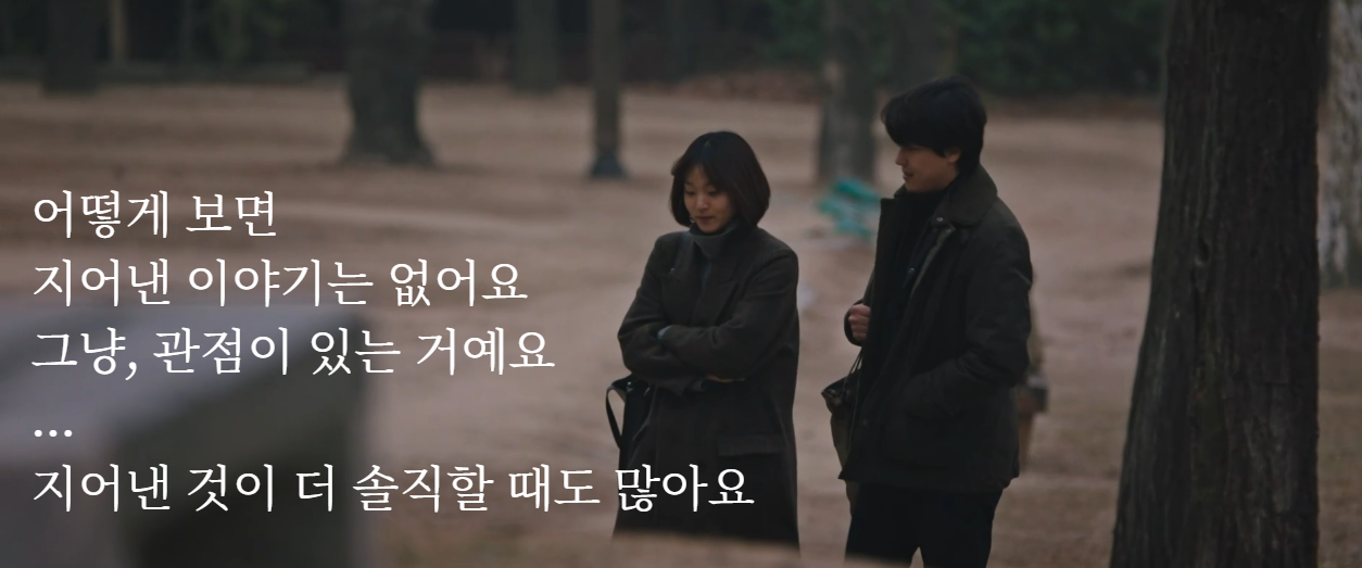 일단 그 당시 내가 느낀 감정은 사실이고, 내 시점에서 그 사실을 인지했잖아요. 그러면 인지된 사실을 바탕으로 이야기를 지어요. 이걸 지어낸 이야기라 하면 지어낸 이야기가 맞고, 또 내가 지은 이야기도 맞고"