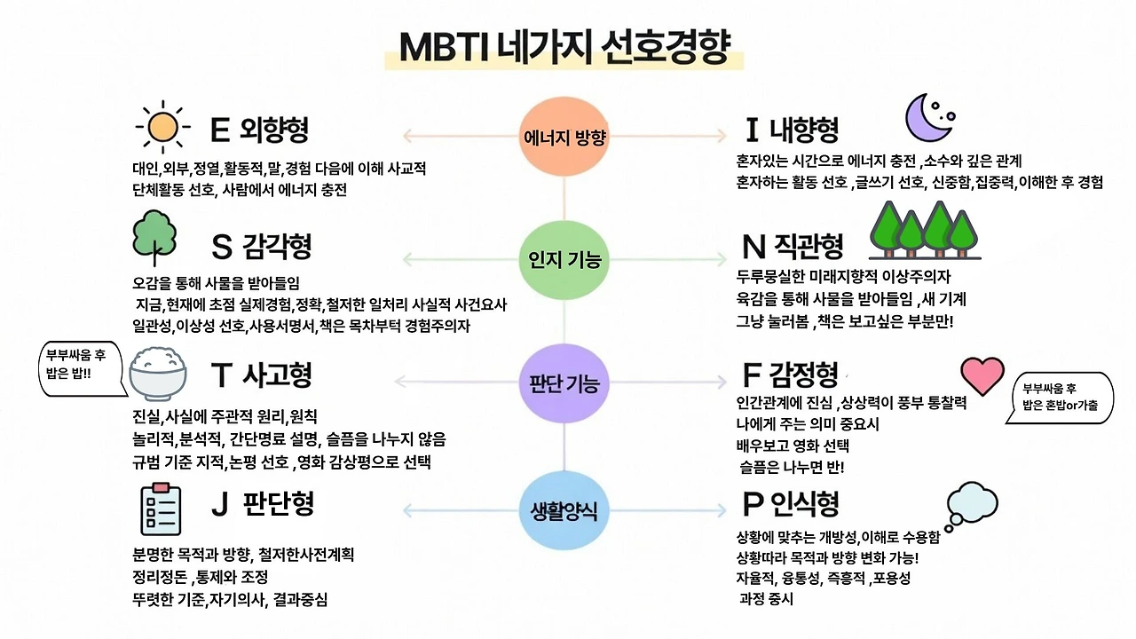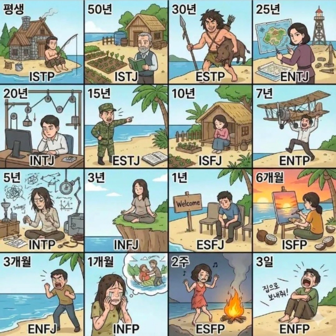 나는 아이들과도 MBTI 이야기를 나눈다. 각자가 자신의 유형을 떠올려 보며 “나는 이런 게 편하고, 이런 건 조금 힘들구나” 하고 말해보는 것만으로도, 서로를 향한 분노와 오해는 한결 부드러워진다. 설명할 언어가 생기면, 감정은 조금 덜 날것이 된다. 그리고 그 작은 차이가 관계를 바꾼다.