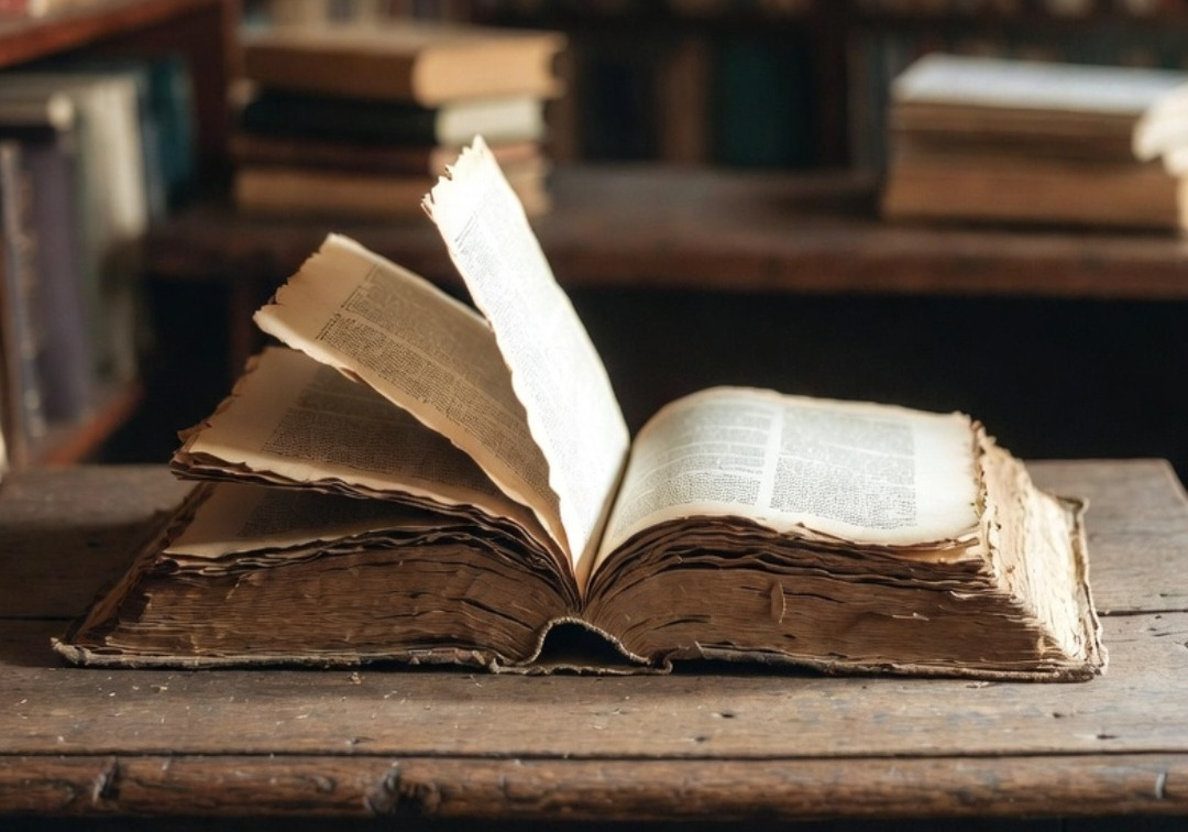 책 더미에서 손가락으로 책 한 권을 뽑아냈다.