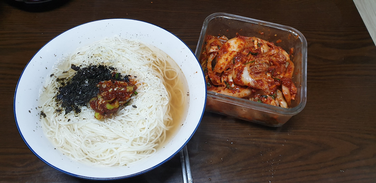 멸치로 국물을 내고 소면을 삶아서 간장을 얹어 먹는 간단한 음식이면서 면 삶는 게 조금은 고난도인 음식.