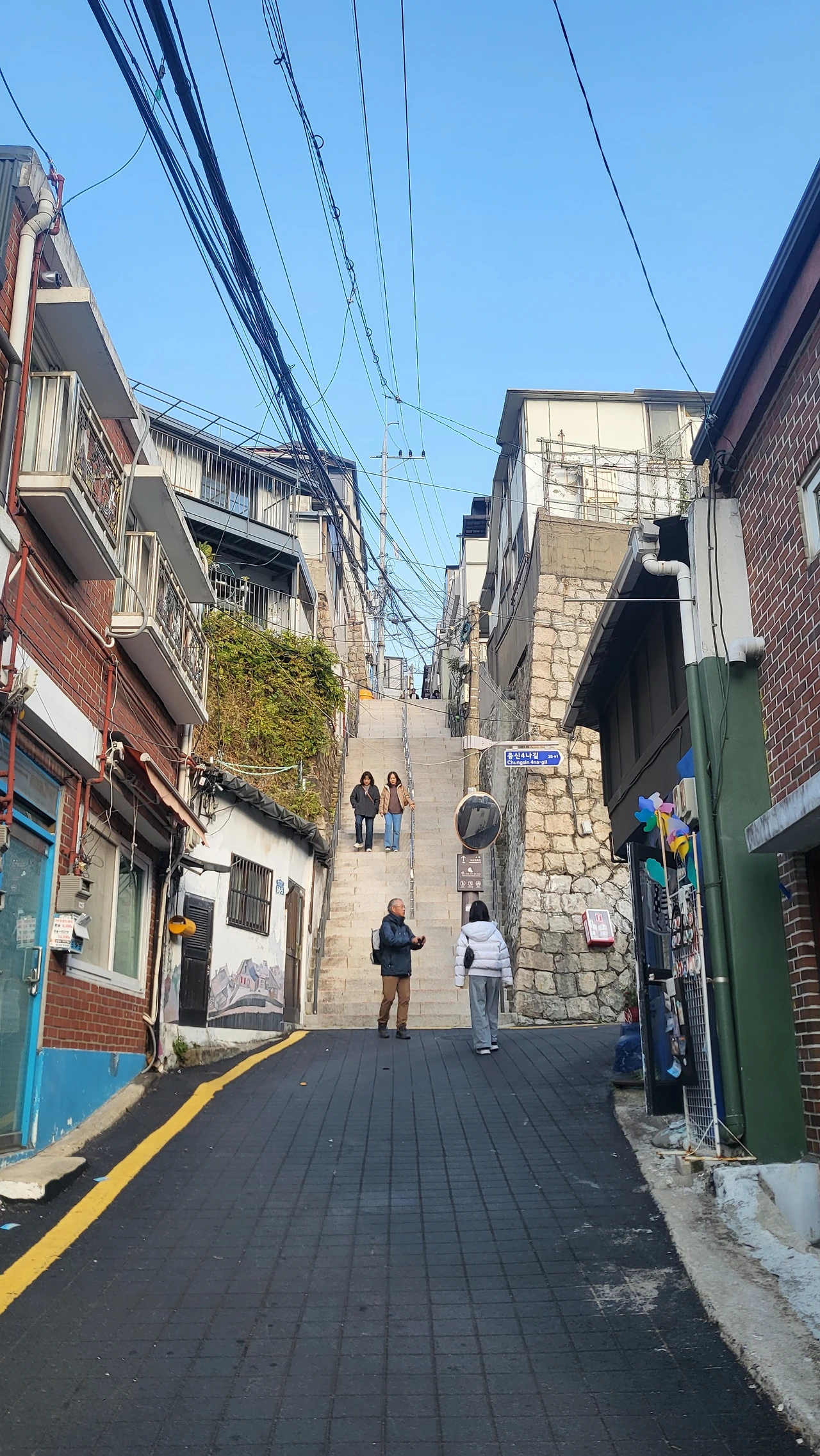 이제는 도시에서 흔히 볼 수 없는 전봇대와 거미줄처럼 이어져 있는 전선줄들이 층층 계단과 어우러져 있다. 낙산 성곽 주변으로 인가들이 닿아 있어서 산책하며 고개만 돌려도 일상의 잡다함을 잡을 수가 있었다. 마당에 심긴 감나무에는 익어가는 감들이 풍성하게 매달려 있었다. 까치와 비둘기들이 감나무 가지에 걸터앉아 늦은 점심식사를 하고 있었다. 골목마다 낮은 지붕과 낮은 벽돌담들은 골목길을 산책하는 사람들에게 또 하나의 풍경을 만들어 주었다. 일상을 품고 있는 낙산공원 골목길은 모든 것이 정겨웠다.