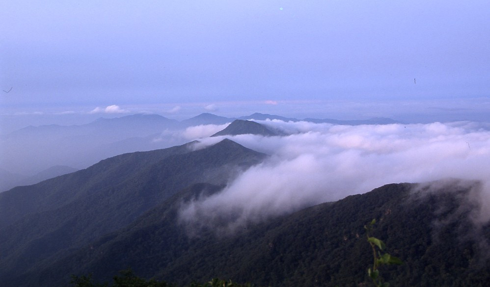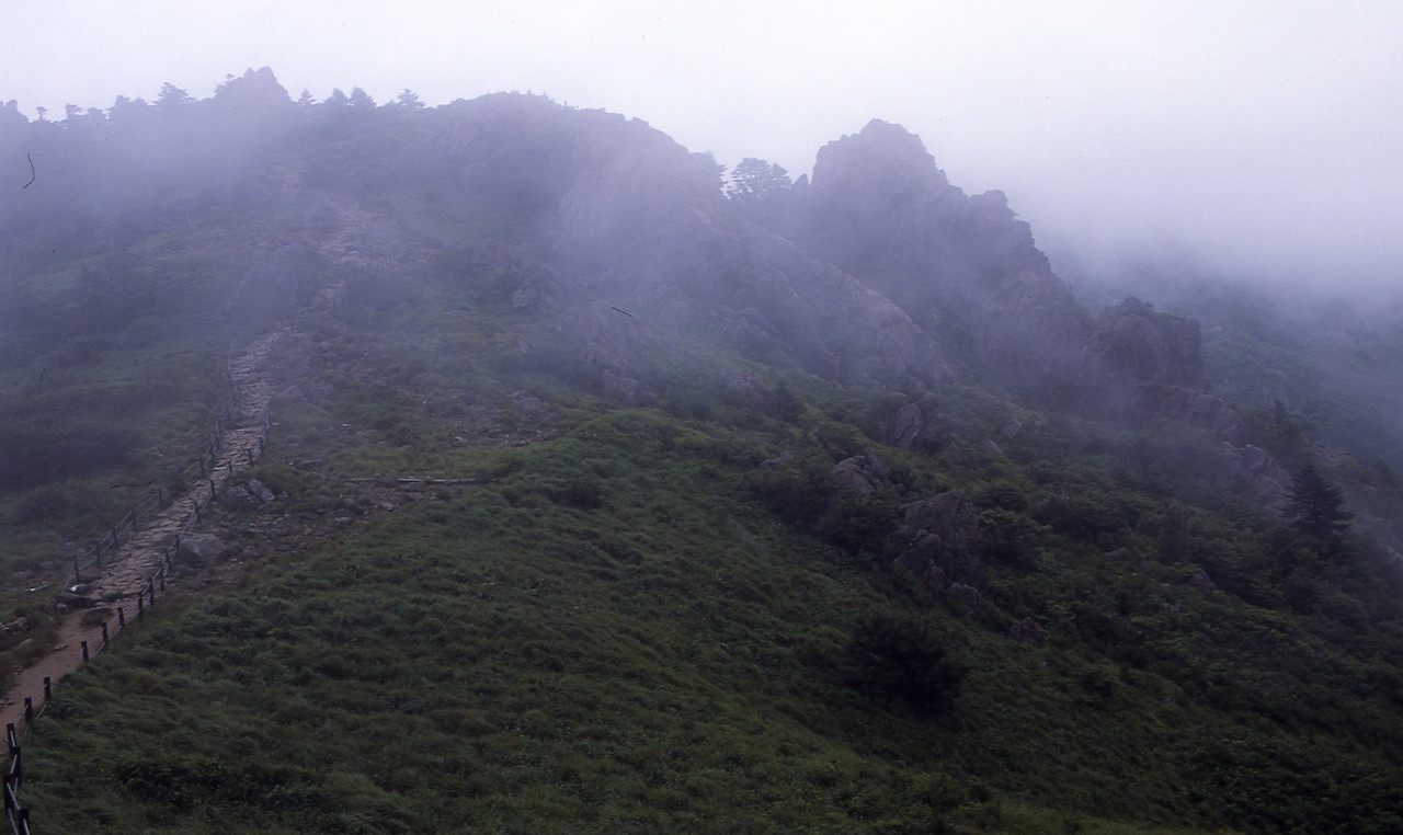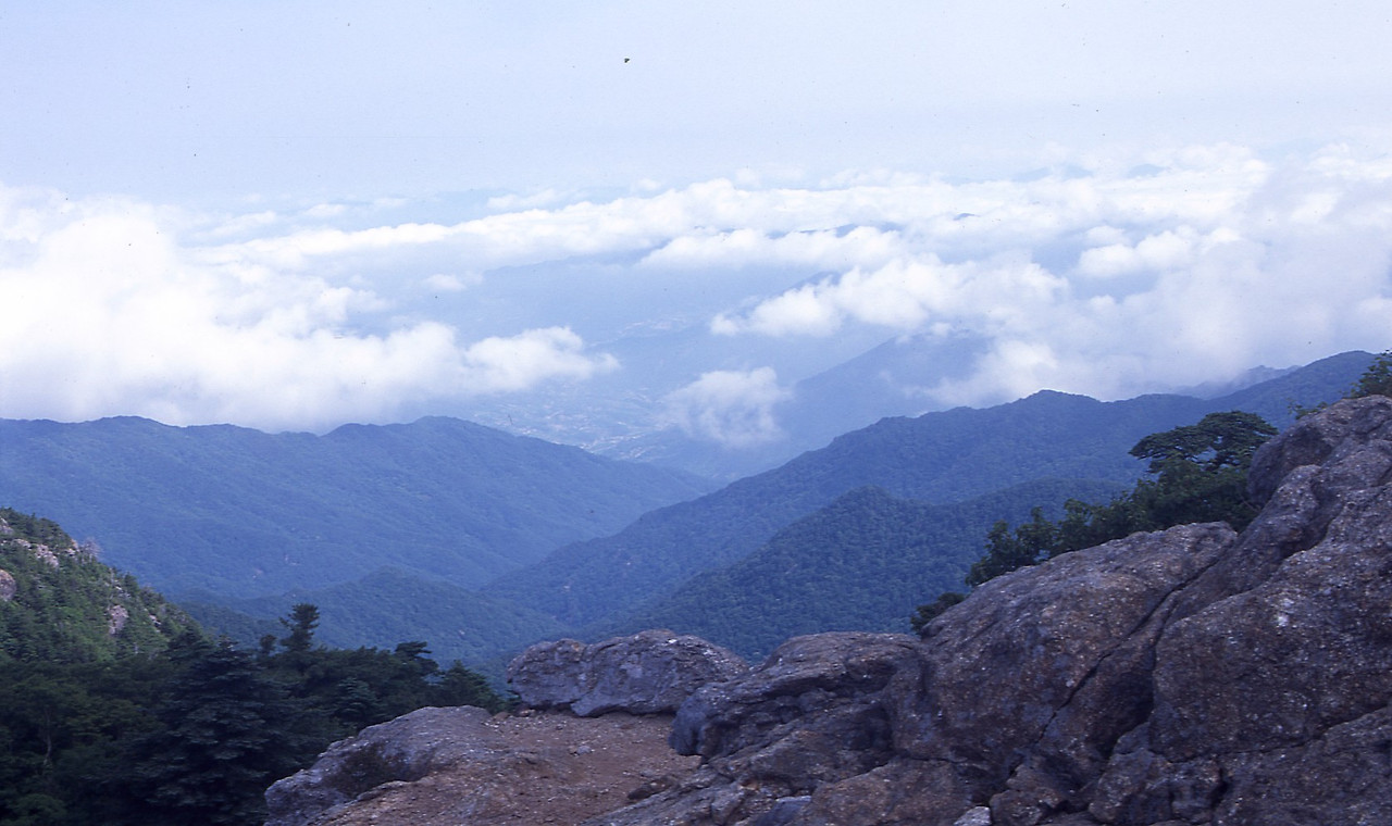나는 능선이 보이면 셔터를 눌렀다. 슬라이드 필름을 많이 소비했다. 능선에서는 누르게 만들었다. 조망점은 능선을 보여주는 곳이었다. 운해와 숨바꼭질하면서 선들의 겹침은 시시각각으로 변했고, 단색의 한 모습이 아니어서 더 좋았었다. 동쪽의 천왕봉을 지나고 서쪽의 천왕봉을 보면서 하늘과 산에서 멀어지고 사람의 마을과 가까워진다. 저 멀리 노고단과 반야봉과 능선이 운무 속에서 아득해진다. 격하게 숨을 헐떡이고 정점에 오르려 하는 것은 능선을 보려 함이고 이는 그곳에서 흥분된 정적 고요를 느끼기 위한 것이리, 봉우리마다에서 곰탕뷰 없이 그곳에서 남녘 능선들과 지리능선들을 잘 감상했다. 최고의 기억과 기록 도구는 가슴과 머리이지만 이는 신이 나서 이야기할 때마다 달라지는 단점을 갖고 있다. 어쩔 수 없이 필름에 기대였다.
