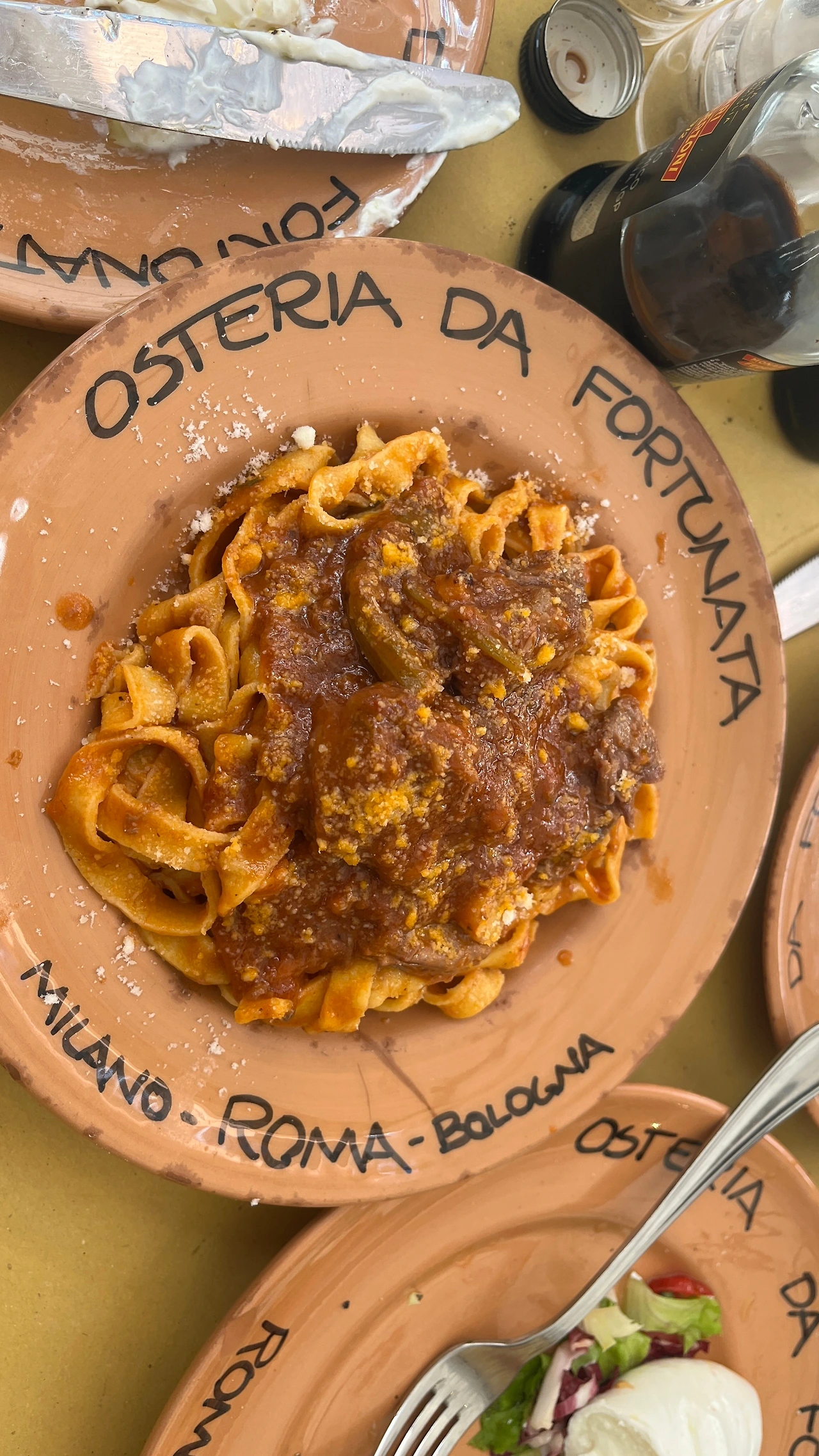 아까 봐두었던 수제 파스타 가게로 향한다. 줄이 많이 줄어들었다. 운이 좋다. 부라타치즈 부르스케타와 홈메이드 라구파스타를 주문한다. 부르스케타가 먼저 서빙된다. 양쪽으로 빵 두 조각, 가운데 부라타치즈가 주인공으로 자리하고 있다. 한쪽엔 토마토 가득, 한쪽엔 엔초비가 올려져 있다. 치즈부터 한입, 쫄깃한 모차렐라 안으로 고소한 리코타치즈가 숨겨져 있다. 우유의 고소한 맛이 가득하다. 부라타치즈를 처음 먹어본다는 누나는 흥미롭다고 했다. 그동안 먹어보고 싶었는데 드디어 먹게 되었다며 좋아했다. 토마토가 올려진 빵과 먹었을 때 잘 어울렸다. 토마토가 신맛이 거의 나지 않고 토마토에서 날 수 있는 좋은 향만 가지고 있는 듯했다. 라구파스타는 실망스러웠다. 면의 두께가 두꺼운데 그 두꺼움이 마냥 좋지 않았다. 종종 손칼국수를 먹을 때면 면끼리 붙어있는 부분이 있다. 약간 덜 익거나 떡진 느낌. 그게 국물에 담겨있을 때는 매력적이기도 하지만 그리 수분감이 많지 않은 소스와 함께하니 조화롭지 못하다는 느낌이 들었다. 라구의 고기는 소갈비 부위처럼 보였다. 소갈비 중에도 뼈와 가까이 있는 부위였는데 육향이 거의 느껴지지 않는 게 아쉬웠다.