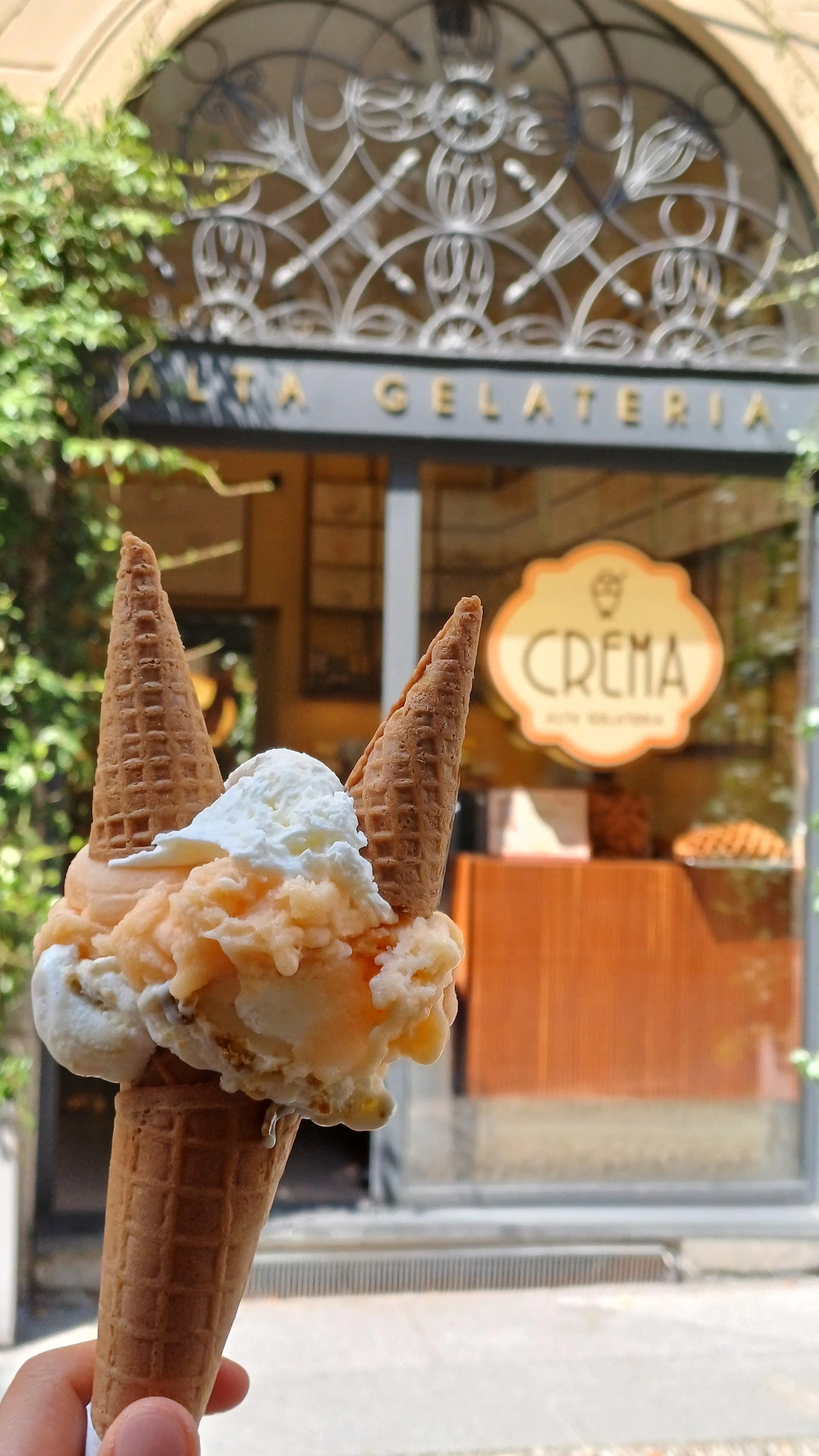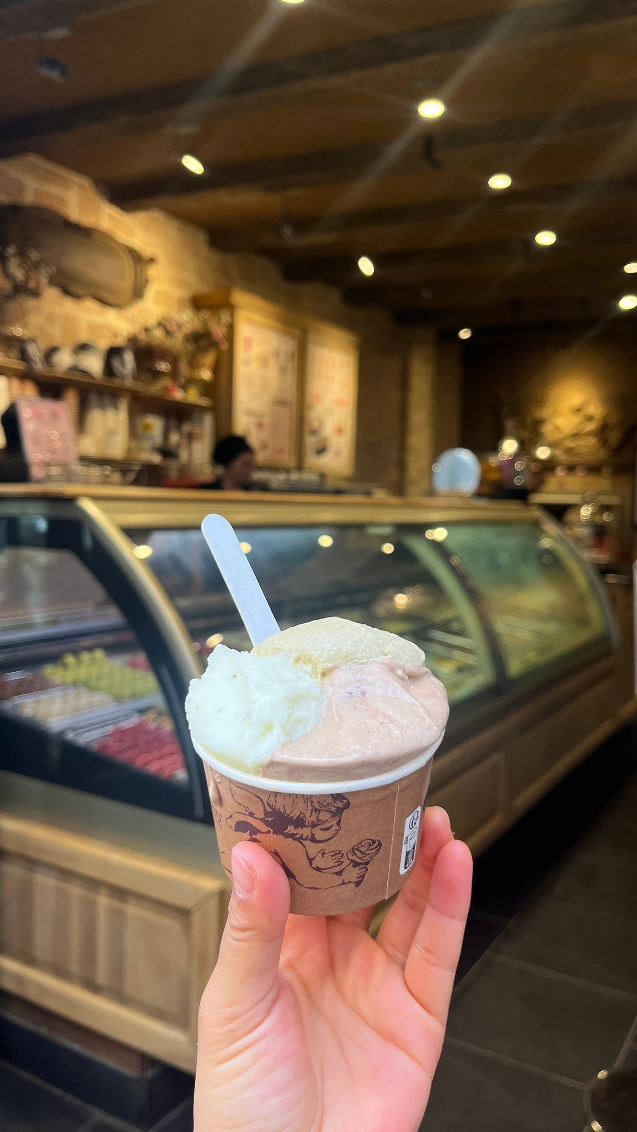 젤라떼리아가 눈에 들어온다. 이탈리아에 와서 가장 먹어보고 싶었던 세 가지 중 한 가지가 젤라또였다. 티라미수와 라임라임, 피스타치오 세 가지 맛을 고른다. 첫 입으로 피스타치오. 우와. 피스타치오 향이 인위적이지 않으면서도 파워풀했다. 첫 입이 가장 맛있었다. 티라미수는 한국에서 판매하는 와일드바디와 맛이 비슷했다. 라임바질은 꽤 새콤하고 바질향이 충분히 강했다. 다만 완벽히 어우러지지 못했다. 내가 이탈리아의 젤라또에 기대할 수 있는 바에 미치지 못했다. 그래도 잘 먹었다며 걸음을 옮기다 미련을 버리지 못하고 구경해 보자며 다른 젤라떼리아로 들어간다. 신중하게 고민한다.