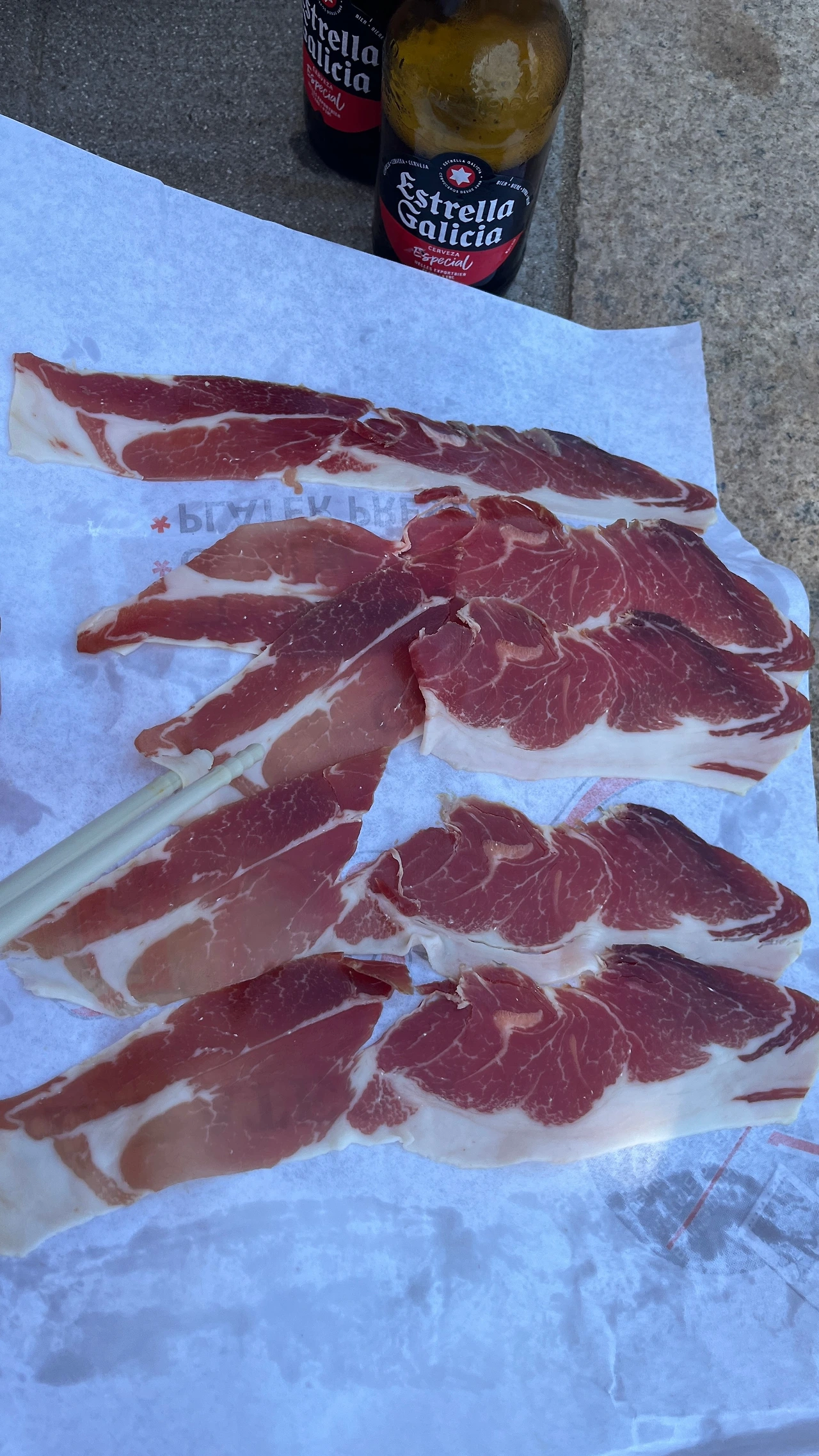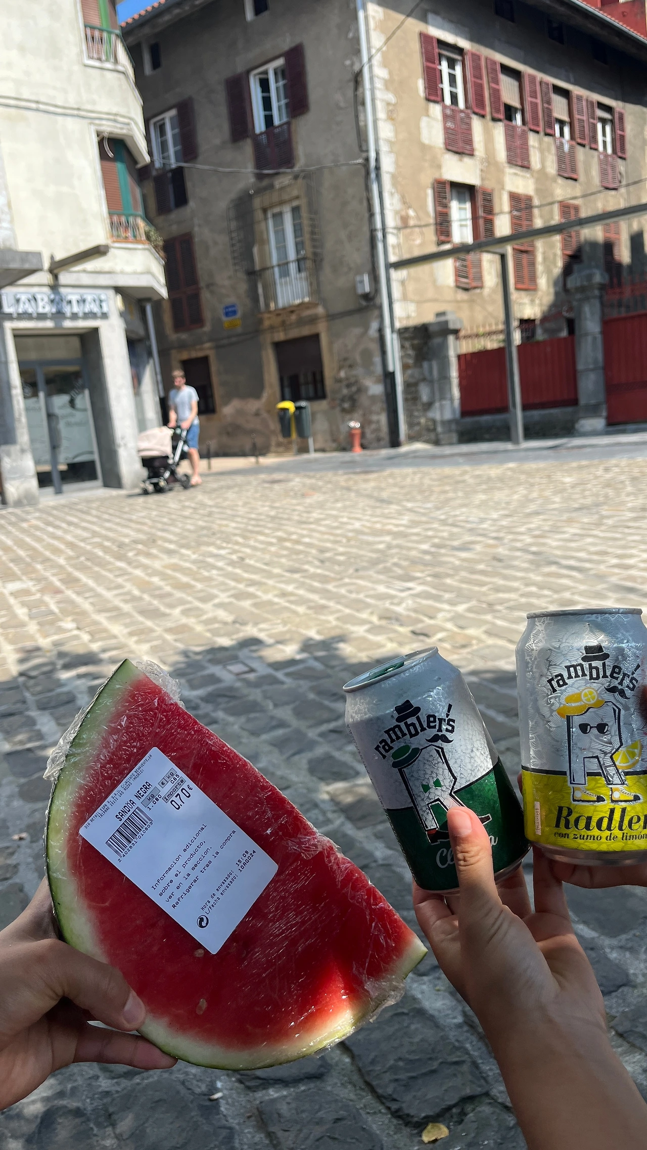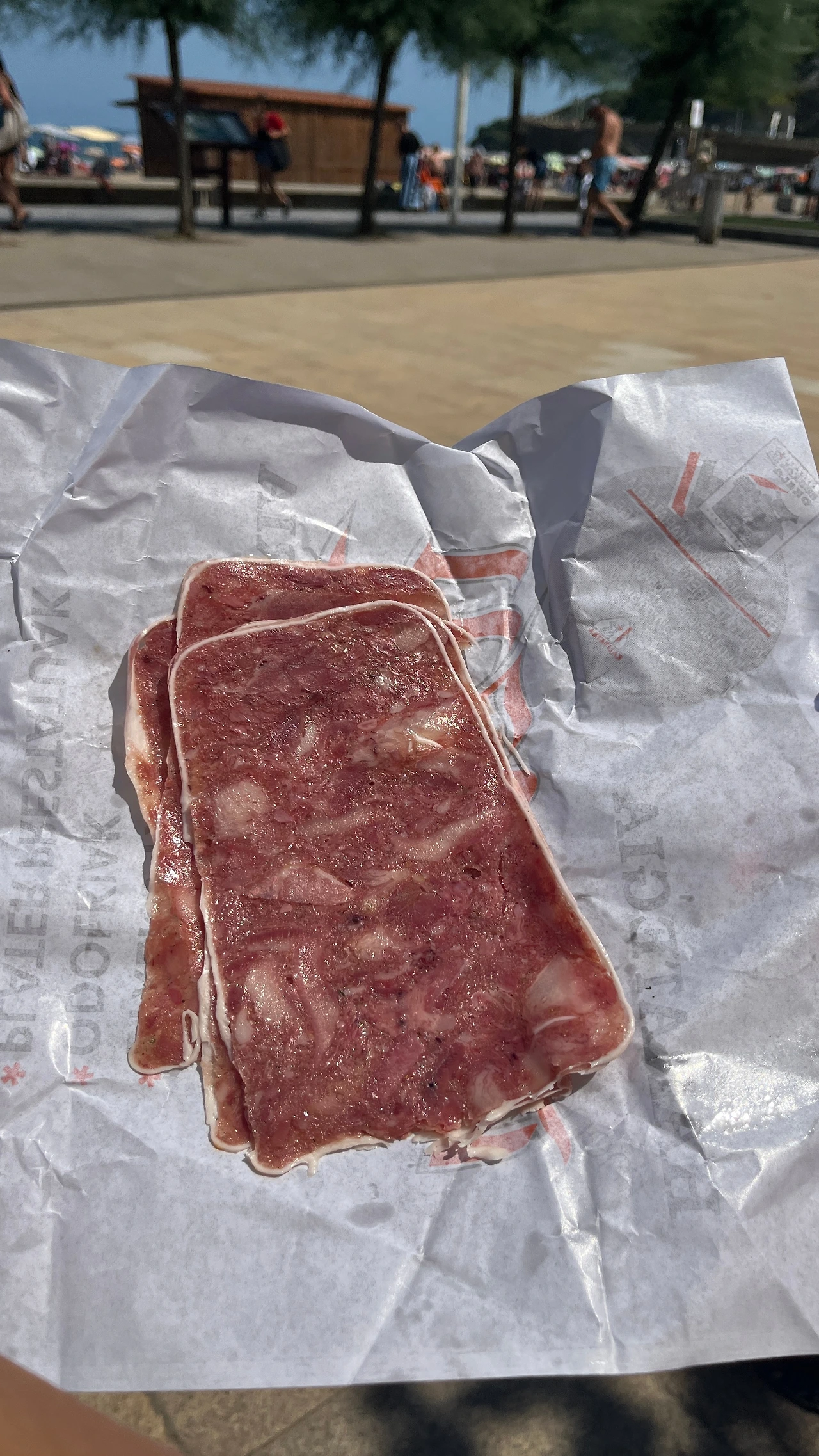벤치에 앉아 우리가 사 온 것들을 펼쳐두고 점심을 먹는다. 정육점에서 직접 고른, 그 자리에서 썰어주시는 햄을 스페인에 와서 먹어보는 경험이 특별했다. 처음 먹은 건 하몽, 여태껏 먹은 것 중, 가장 비싼 하몽이었다. 실온에 진열되어 있는 그것의 비주얼이 흥미를 끌었고 가격대가 높아짐에 따라 맛이 어떻게 변하는가 하는 것이 궁금했다. 살코기 부분의 맛은 여느 그것과 비슷했으나 지방의 향이 깨끗하고 풍미가 좋았다. 두 번째로는 라콘이라는 햄을 먹었다. 넓적한 햄이었는데 처음 보는 이름이었고, 넓은 햄 중에도 많이 먹던 것과는 다른 비주얼이라 구매해 보았다. 기억에 남을 만한 특장점은 없었지만 충분히 맛있었다. 마지막으로는 Txarri Burua라는 이름의 햄이었다. 틀에 넣고 굳힌 듯 각진 모양을 가지고 있었고, 자세히 보니 머릿고기 같았다. 돼지의 코와 귀가 포함되어 있었다. 누나에게 어떤 고기로 만들어진 것인지 알리지 않은 채 맛을 물었다. 누나는 순댓국 맛이 난다고 했다. 세 가지 햄 중 가장 기억에 남고 또 먹고 싶은 것을 고르라면 단연코 그것이다. 머릿고기가 내는 녹진한 지방의 맛에 로즈메리의 향이 났다. 특장점과 캐릭터가 확실하다는 게 좋았다. 지나치게 완벽한 식사였다.