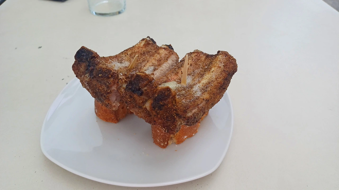 1시쯤 알베르게에 도착해 가방을 내려두고 마을에 있는 카페로 발걸음을 향한다. 맥주 두 잔을 주문해서 마시다 배가 고파오기에 어떤 메뉴를 주문해 본다. 번역기에 갈비라고 나오는 무엇을 주문해 보았다. 바게트 한 조각 위에 등갈비가 통으로 튀겨져 올라가 있었다. 소금 간이 강하게 되어 있었고 독특하게 큐민을 듬뿍 뿌려두었다. 갓 튀겨져 나와 매우 뜨거웠다. 기다리는 시간이 길어지더라도 바로 조리해서 받아들 수 있는 음식을 좋아한다. 바삭한 식감과 큐민의 향이 대단히 맛있었다.