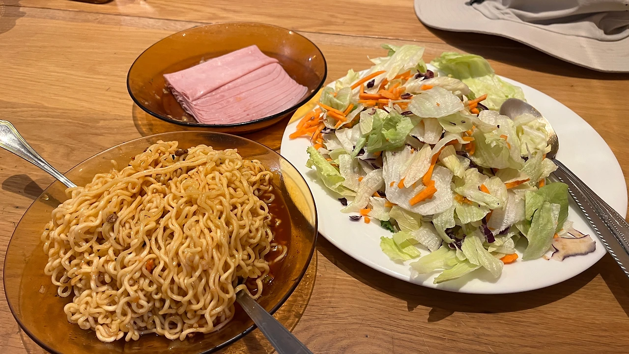 저녁으로는 냉라면을 해먹었다. 햄과 샐러드도 곁들인다. 점심 식사에서 못다 채운 한식에 대한 갈증을 확실하게 씻어주었다.