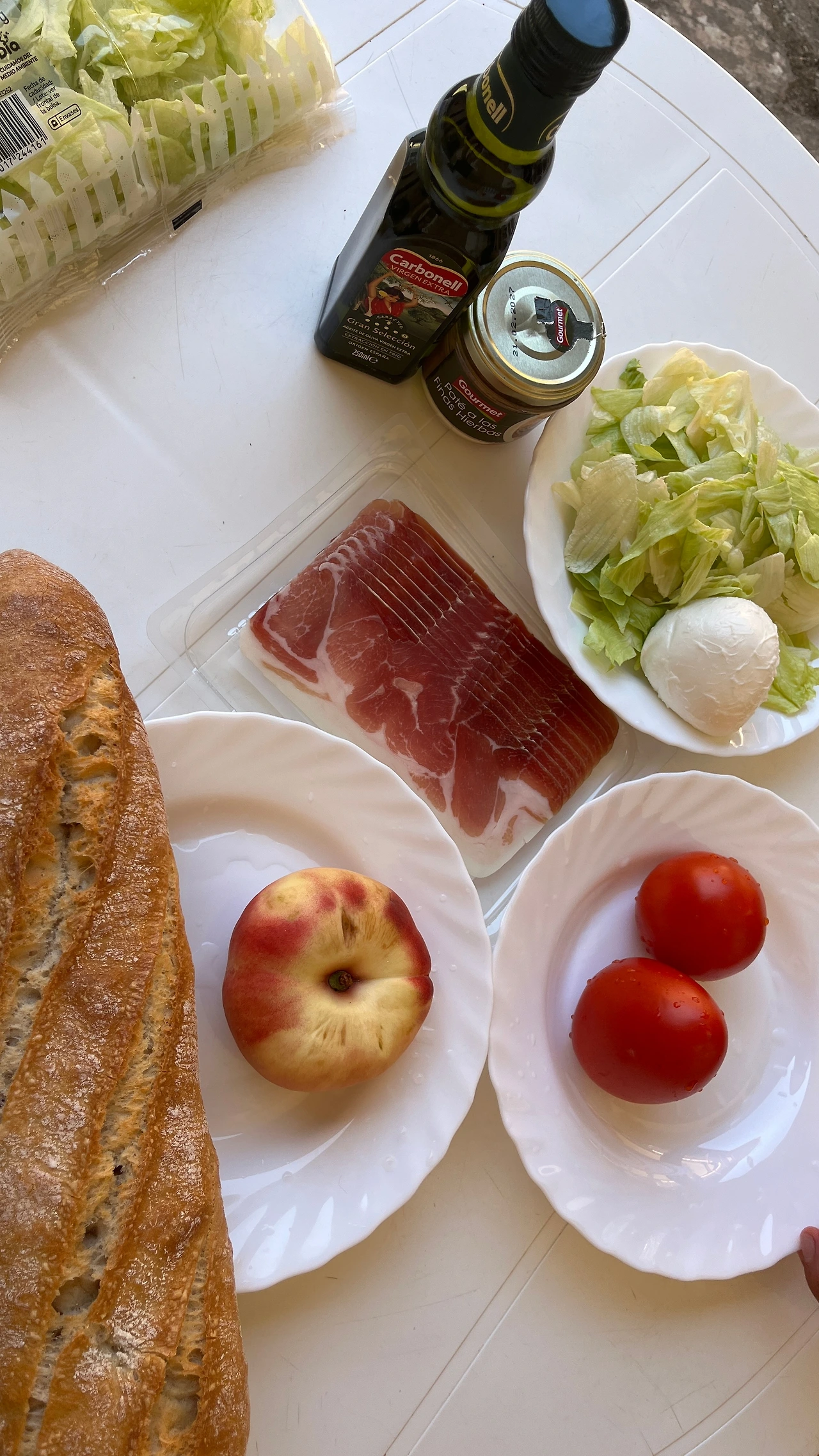 마트에 들러 점심으로 먹을 것들을 사들고 알베르게에 체크인을 했다. 야외테이블에 자리 잡고 앉는다. 순례길을 걸으며 점심은 늘 장을 봐서 먹는다. 오늘은 카페에서의 감동이 가시질 않아 하몽, 맛있지만 한국에선 비싼데 유럽에선 저렴한 프레시 모짜렐라, 유럽의 것이 맛있다는 얘기가 떠올라 사본 토마토, 늘 함께하는 쌀밥 같은 바게트와 양상추, 그냥 맛있어 보여 사온 복숭아가 함께한다. 하몽은 그 감동을 이어 주기에 부족했고, 치즈는 늘 그렇듯 자기 몫을 훌륭하게 해 주었다. 토마토는 한국의 것과 무엇이 다른지 모르겠고, 오늘의 바게트는 완전 성공! 복숭아도 맛있었다. 오늘의 베스트는 바게트를 갈라 토마토즙을 짜내고 올리브오일을 듬뿍 부어 한입 크앙 하는 거.