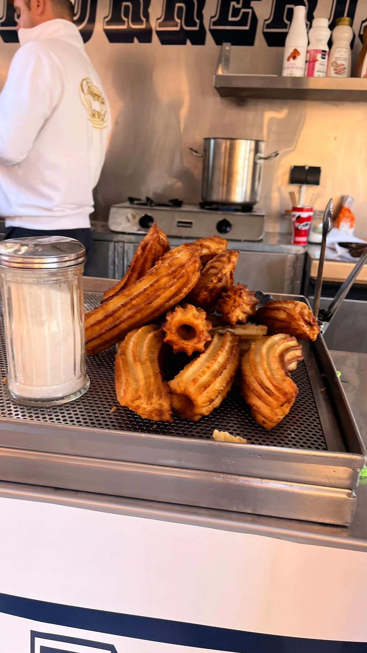 한 번에 길게 반죽을 뽑아내 둥글게 모양내서 튀기고 가위로 잘라 콘모양 포장용기에 담아주었다. 우리 앞에 있던 아저씨는 15유로어치를 사갔다. 저 커다란 것이 한 줄 하고도 반은 더 들어갔다. 그 츄러스는 누굴 위한 것인지 알 수 없지만, 그의 모습을 보며 주말 아침 일찍 일어나 산책 다녀오며 츄러스 왕창 사가는 아버지의 모습을 상상했다.