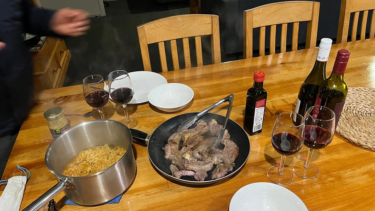 저녁으로 양고기를 굽고 라면을 끓였다. 와인은 다른 두 가지 품종을 구매해 비교하며 마셔보았다. 소스로는 홀그레인 머스터드를 곁들였다. 뉴질랜드 양고기 품질이 좋다고 듣고서 왔는데 과연 이었다. 도축한 지 오래 지나지 않아서인지 기름향이 깨끗했고 잡스러운 뒷맛을 남기지 않았다. 스테이크처럼 구워 칼로 썰어먹었다. 근막은 따로 잘라내 두었다가 고기를 다 먹고서 고기 구운 팬에 천천히 튀겨내 먹었다.