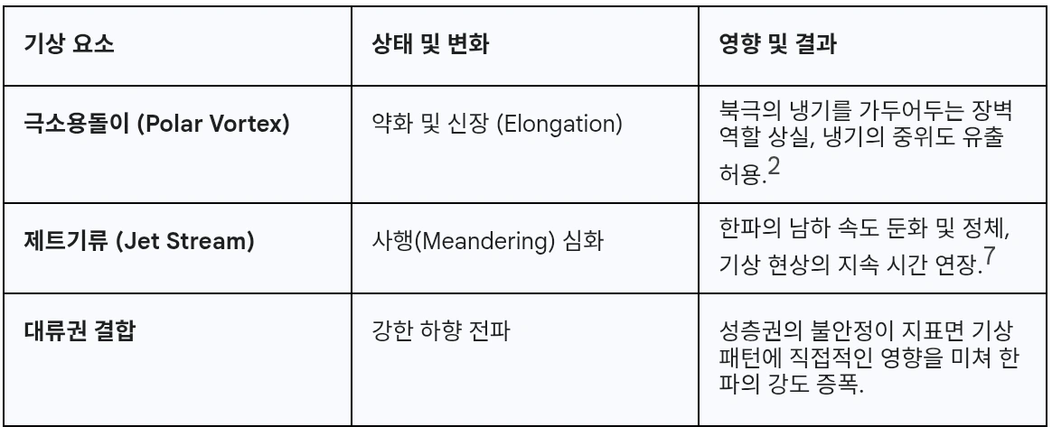 극소용돌이가 둥근 형태를 유지하며 빠르게 회전할 때는 찬 공기가 북극권에 갇혀 있지만, 이번 경우처럼 소용돌이가 약화되어 길게 늘어지거나 쪼개질 경우, 그 틈을 타고 영하 30~40도에 육박하는 냉기 덩어리가 미국 본토 깊숙이 침투하게 됩니다. '펀(Fern)'은 바로 이 떨어져 나온 냉기 덩어리(Cold Core)가 멕시코만에서 유입된 다량의 수증기와 충돌하면서 발생했습니다.