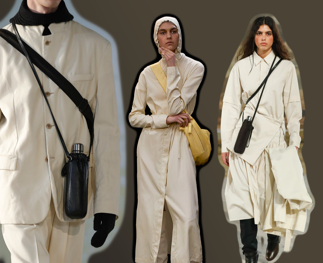 22FW에서 주목할 만한 점은 르메르가 중앙아시아 유목민 전통 의상에서 착안한 피스들을 선보이고 있다는 것입니다. "옷을 입는 것은 여행을 떠나는 것과 비슷하다"는 사라 린 트란의 아이디어로부터 시작됐죠. 그리하여 22 FALL 쇼는 '현대판 수렵채집인'의 모습을 보여 줍니다. 모래폭풍으로부터 몸을 보호하기라도 하려는 듯, 겹겹이 레이어링 한 스타일이 자주 등장하지요. 특히 목과 얼굴을 덮는 탑, 종교 의상을 닮은 튜닉, 팬츠를 견고하게 감쌀 수 있는 부츠는 21FW부터 점점 더 많이 보이고 있다. 무엇보다 새로이 선보인 'Water bottle-Carrier'는 그 화룡점정이 아닐까요.