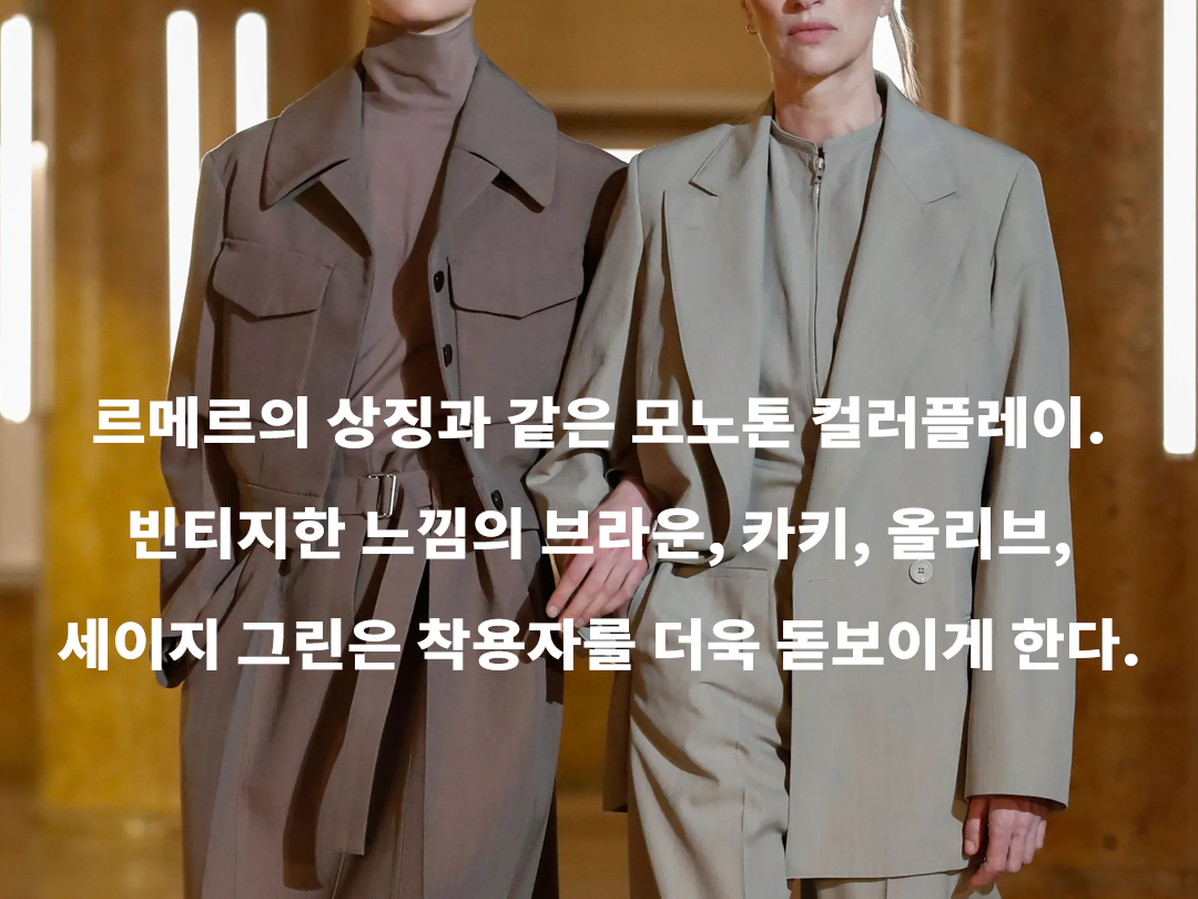 실루엣만큼이나 영향력이 있던 르메르의 컬러웨이. 몇 년 전부터 각광받은 톤온톤/ 어스 컬러 스타일링은 르메르가 가장 훌륭하게 보여주었던 것 중 하나죠. 그들이 활용하는 저채도의 브라운, 카키, 그린은 항상 높은 완성도를 보여줄 뿐만 아니라 착용자를 돋보이게 합니다. 때문에 르메르의 쇼에서는, 모델들에게도 많은 눈길이 갑니다. 빈티지한 어스 컬러는 모델진의 피부색에 관계없이 훌륭하게 어울리기 때문이죠.