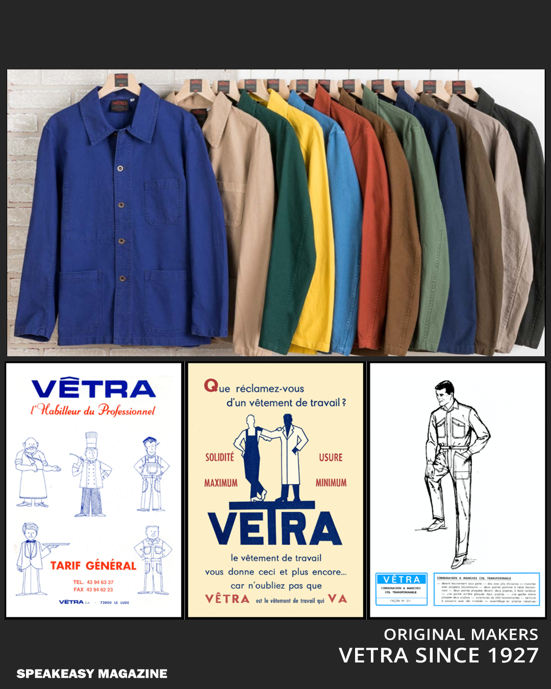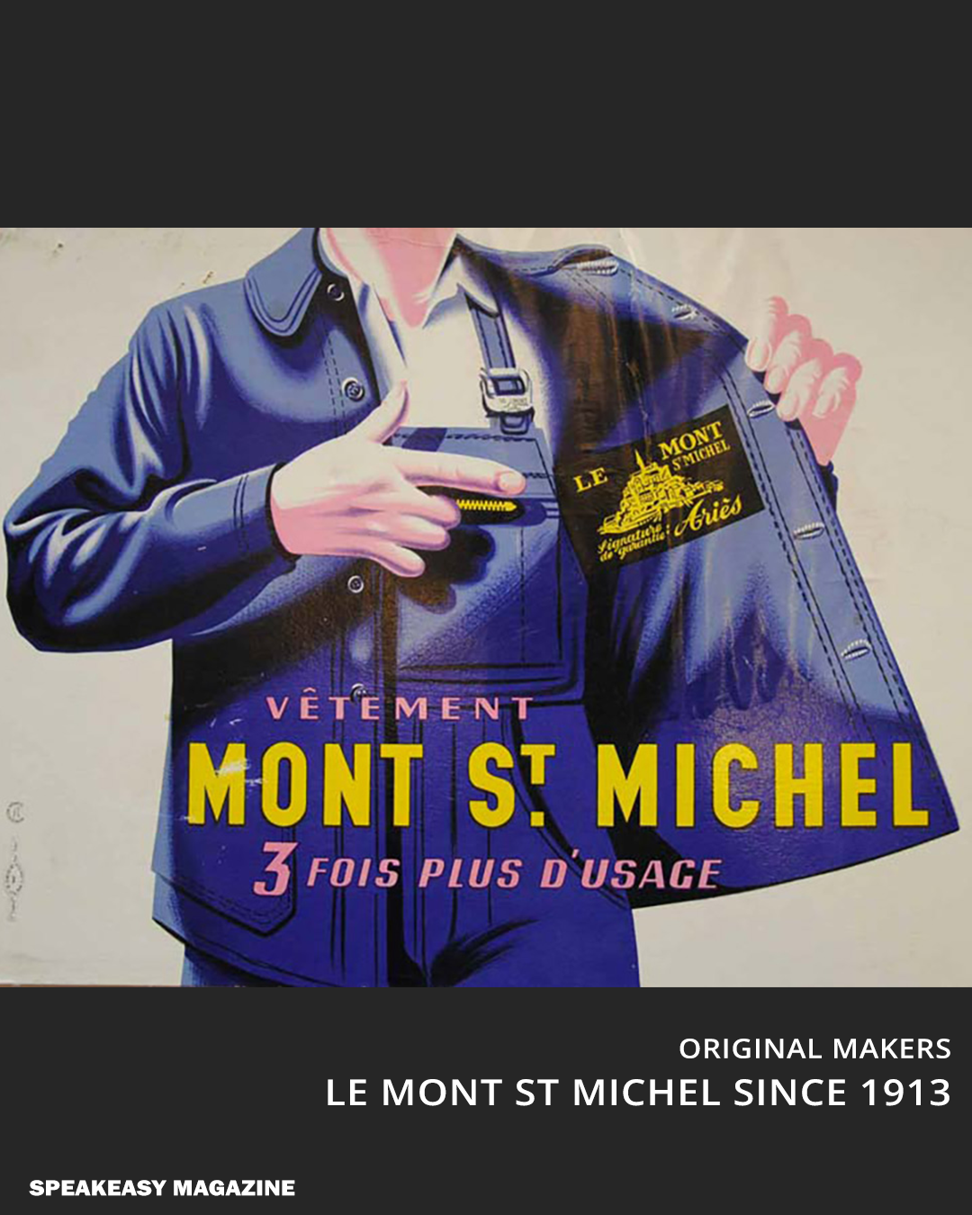 가장 오래된 생산 브랜드 '르 몽 생 미셸'은 몰스킨 코튼으로 제작한 프렌치 워크 재킷을 선보였으며, 100년이 지난 지금도 같은 소재로 계속 생산하고 있습니다. 내구성은 그것의 존재 목적이었기에 단단하고 거칠며, 방수가 훌륭한 몰스킨 코튼을 이용했습니다. 당시 가장 생산하기 용이했던 푸른색은 프렌치 워크 재킷의 상징이 되었습니다.