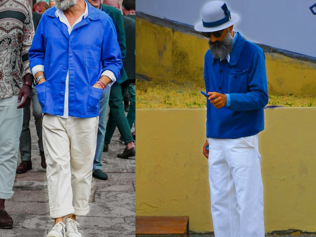 프렌치 워크 재킷은 1900년대 초 처음 등장합니다. 프렌치 워크 재킷에는 몇 가지 두드러지는 특징이 있습니다. 푸른 몰스킨 코튼 원단, 3개의 오픈 포켓, 다섯 개의 단추.