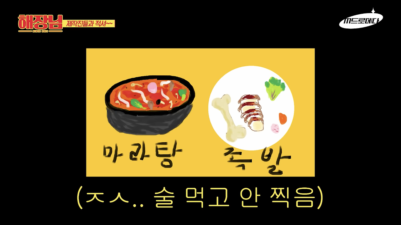 M드로메다 스튜디오의 웹 예능인 <해장님>은 그 흑역사들을 다시 불러낸다. <해장님>은 술을 해장하는 갖은 방법들을 리뷰하는 예능으로, 개그우먼 이은지 씨가 술을 마신 다음 각기 다른 해장거리로 숙취를 푸는 과정을 담는다. “영상에서 술 냄새나요”라는 댓글처럼 술자리의 분위기가 고스란히 전해진다.