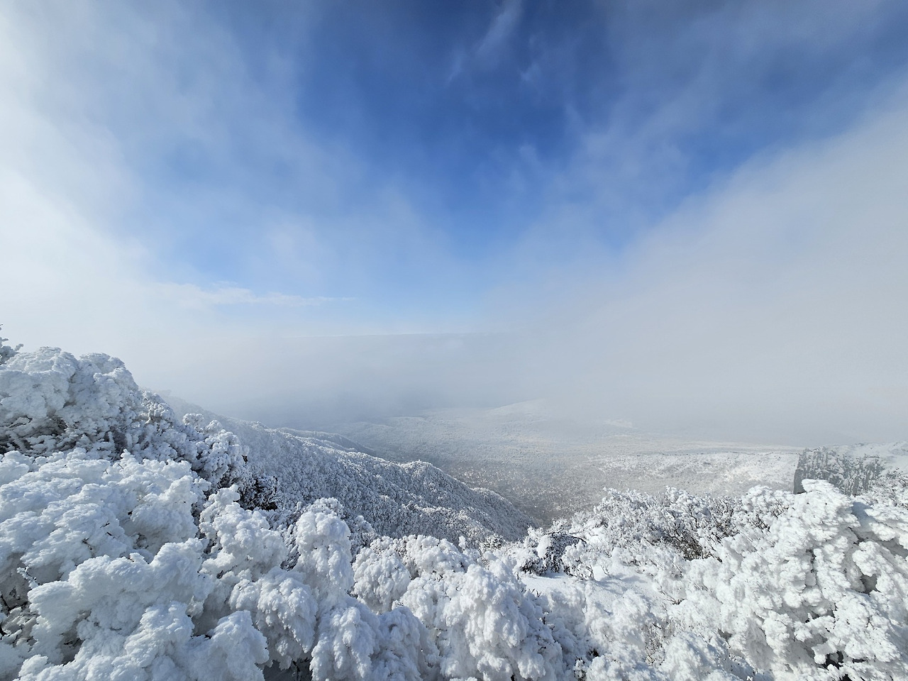 오르막이 끝나고 눈앞이 뻥 뚫리더니 비현실적인 풍경이 펼쳐졌다. 하얀 눈꽃 세상이다. 다른 세상에 온 것 같다. 눈꽃을 단 나무들의 키가 작아지고 하늘이 많이 보이면서 알프스인지, 천국인지 모르겠다. 흥분해서 남편에게 영상통화를 걸었다. 남편도 모임이 있어 선배랑 호텔에 있다. “자기야, 보여?” 들뜬 목소리로 물어본다. “어, 이쁘네.” “아니, 나 말고 한라산 경치 보이냐고.” “응, 보여, 멋지네.” 기대보단 약한 반응이다. 휴대폰으로 이곳저곳을 비춰 주었다. 내가 이병헌이 된 것 같다.