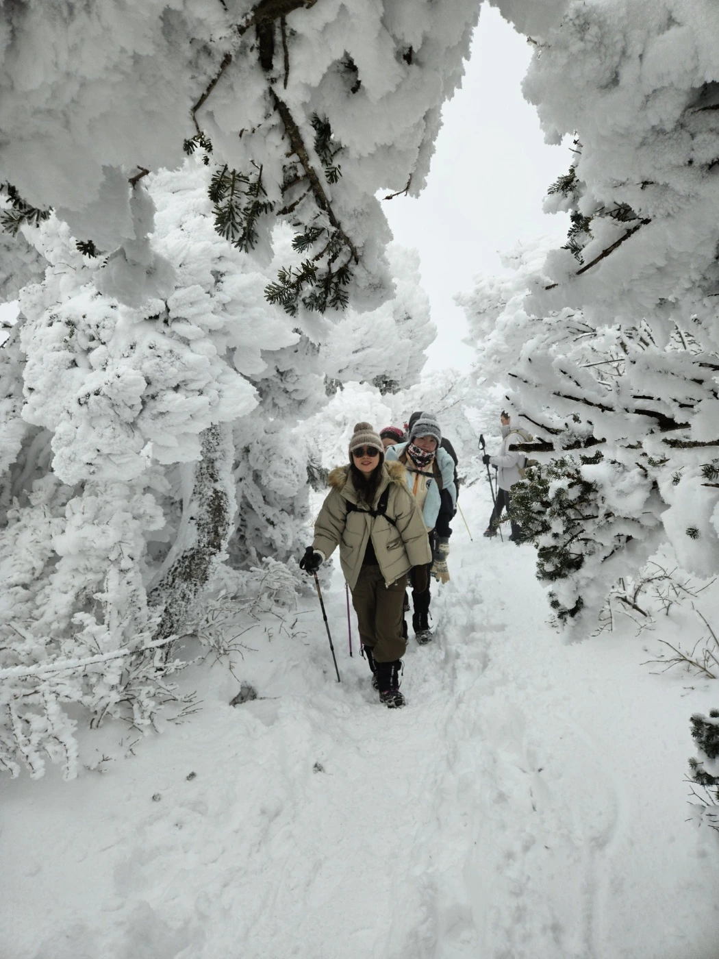 처음에는 완만한 경사로 시작하더니 계단이 나오기 시작했다. 계단은 눈으로 덮여 이미 층은 무시되었지만 이곳이 계단이었다는 것은 옆에 있는 기둥과 가로로 묶여 있는 보호줄로만 알 수 있었다. 눈이 얼마나 쌓였는지 보호줄은 발목 근처에 자리하고 있었다. 뒤돌아보니 내 뒤로도 끝도 없이 줄지어 온다.