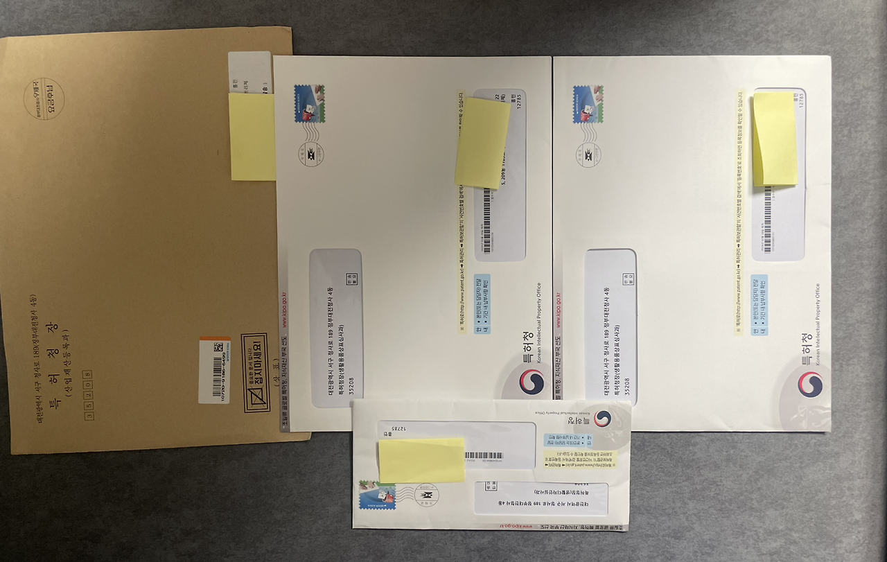 황색 대봉투는 특허 상표 디자인 등록증이고 흰색 대봉투는 특허 상표 디자인이 등록되기 전에 발송되는 등록 결정서이며 작은 우편봉투는 의견제출통지서나 디자인 등록결정서이다.