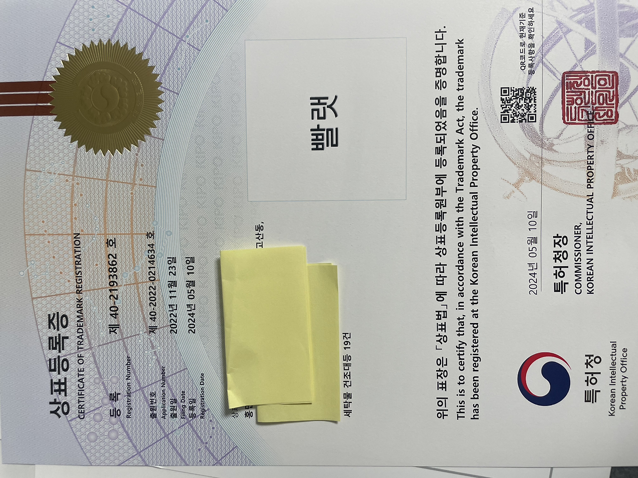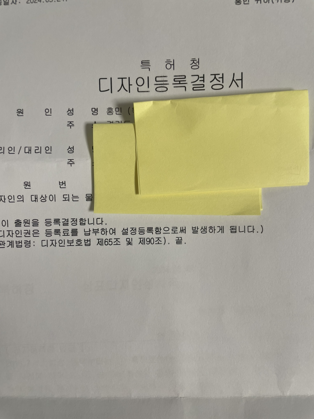 제품 관련 디자인 등록결정서와 상표등록증이 한꺼번에 배달되었다.