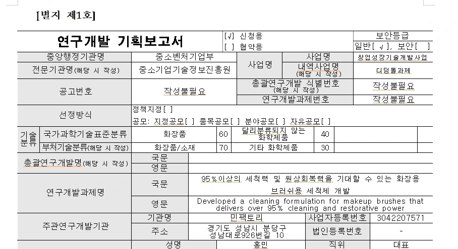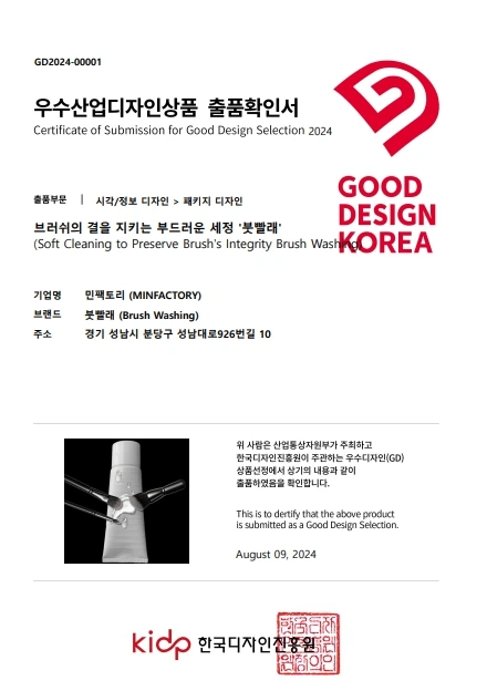 이와 같은 내용으로 메이크업 브러쉬 세척의 원상력 회복을 기대할 수 있는 브러쉬 세척제 개발로 중소기업 R&D연구개발 및 특허를 출원했고 관련해서 2023년에는 경기도 지원으로 브러쉬 세척제도 개발하였습니다.