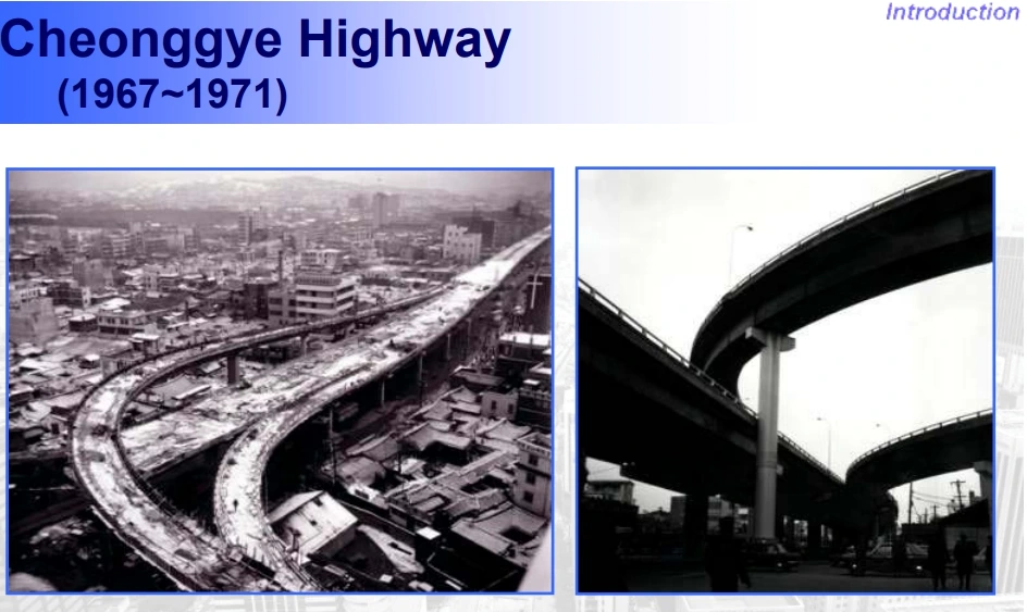 하천은 도시의 뒤안길로 밀려났고, 콘크리트 구조물과 매연이 그 위를 점령했다. 그러나 이 복개와 고가도로는 단지 도시 공간의 재배치가 아니라, 근대화의 속도에 쫓긴 도시의 선택이자 압축 성장의 상징으로 보인다.