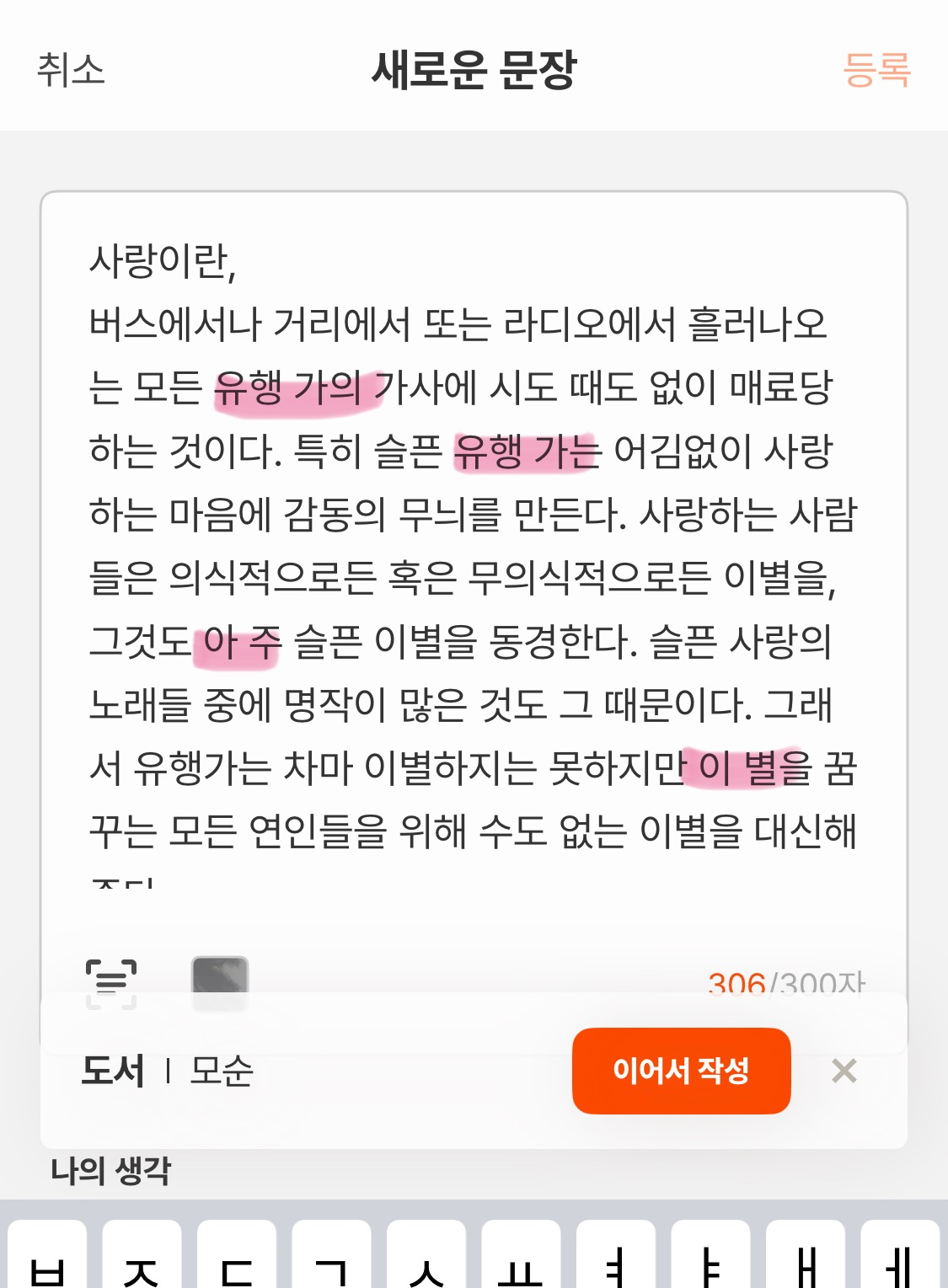 또한, 텍스트를 추출하면 띄어쓰기 오류가 발생하는 문제가 있다. 책의 문장 앞부분에서 띄어쓰기가 엉망이 되는 경우가 많아, 사용자가 직접 수정해야 한다. 이를 개선하려면, 띄어쓰기 자동 보정 기능을 추가하면 좋을 것 같다. 맞춤법 검사까지는 필요 없을 것 같고, 기본적인 띄어쓰기 정렬 기능만 있어도 글 입력 과정에서의 사용자 경험이 크게 향상될 것이다.