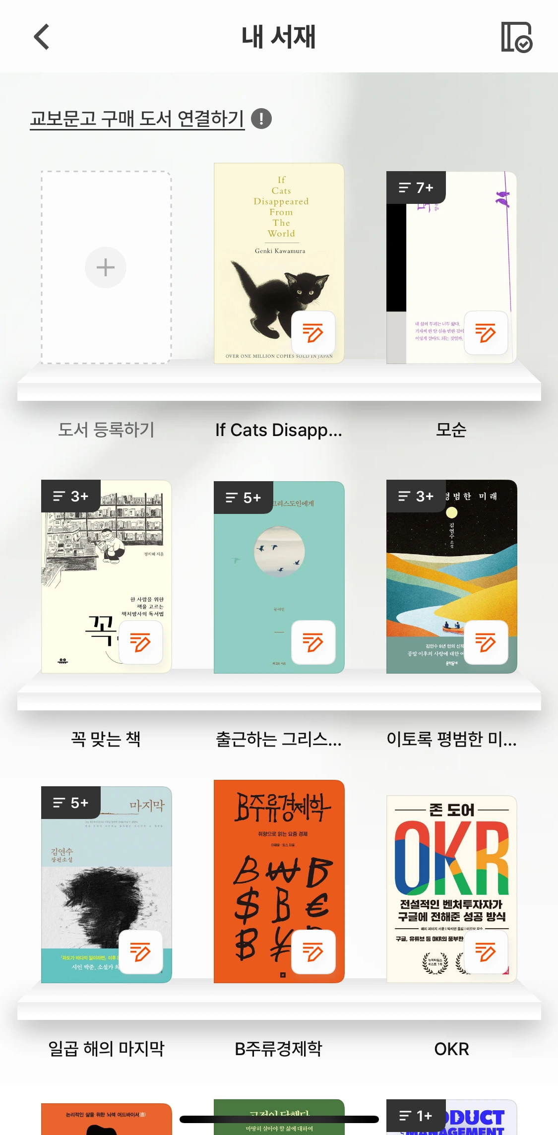 - 2025년, '내 서재' 기능이 배포되었다. 교보문고에서 구매한 책은 자동 연동되며, 직접 책을 등록할 수도 있다. 특히 ISBN 촬영 기능이 매우 편리하다.