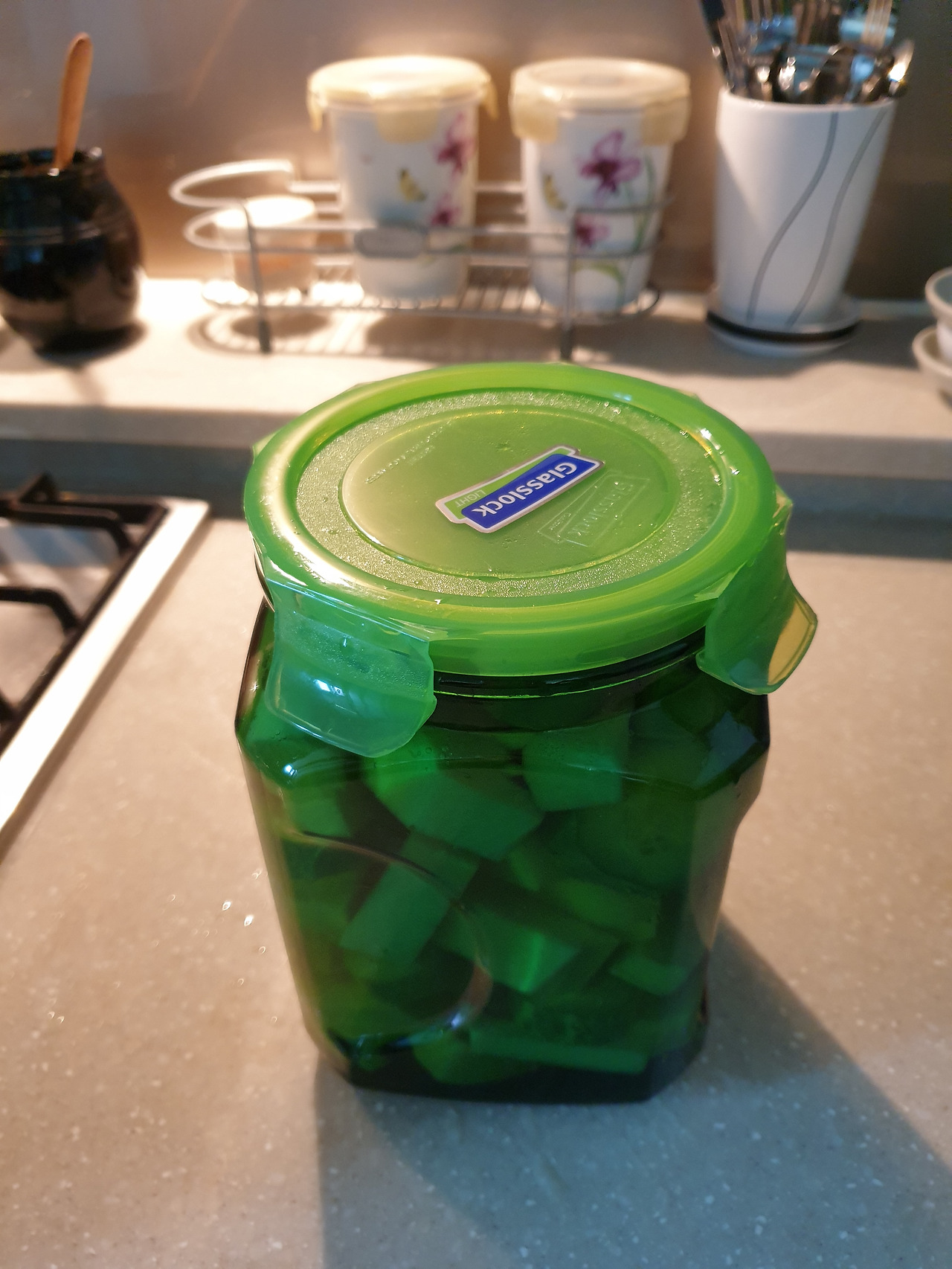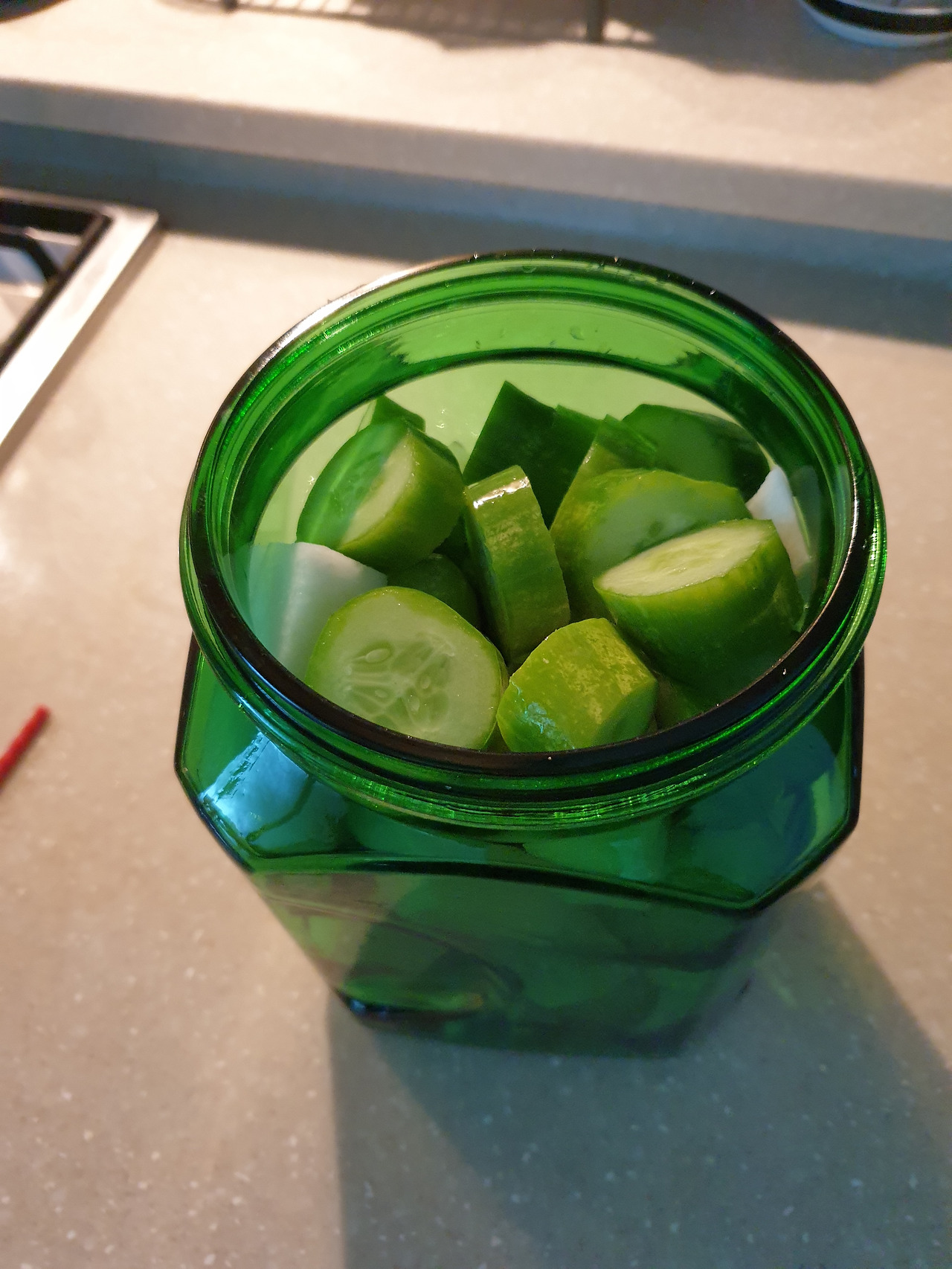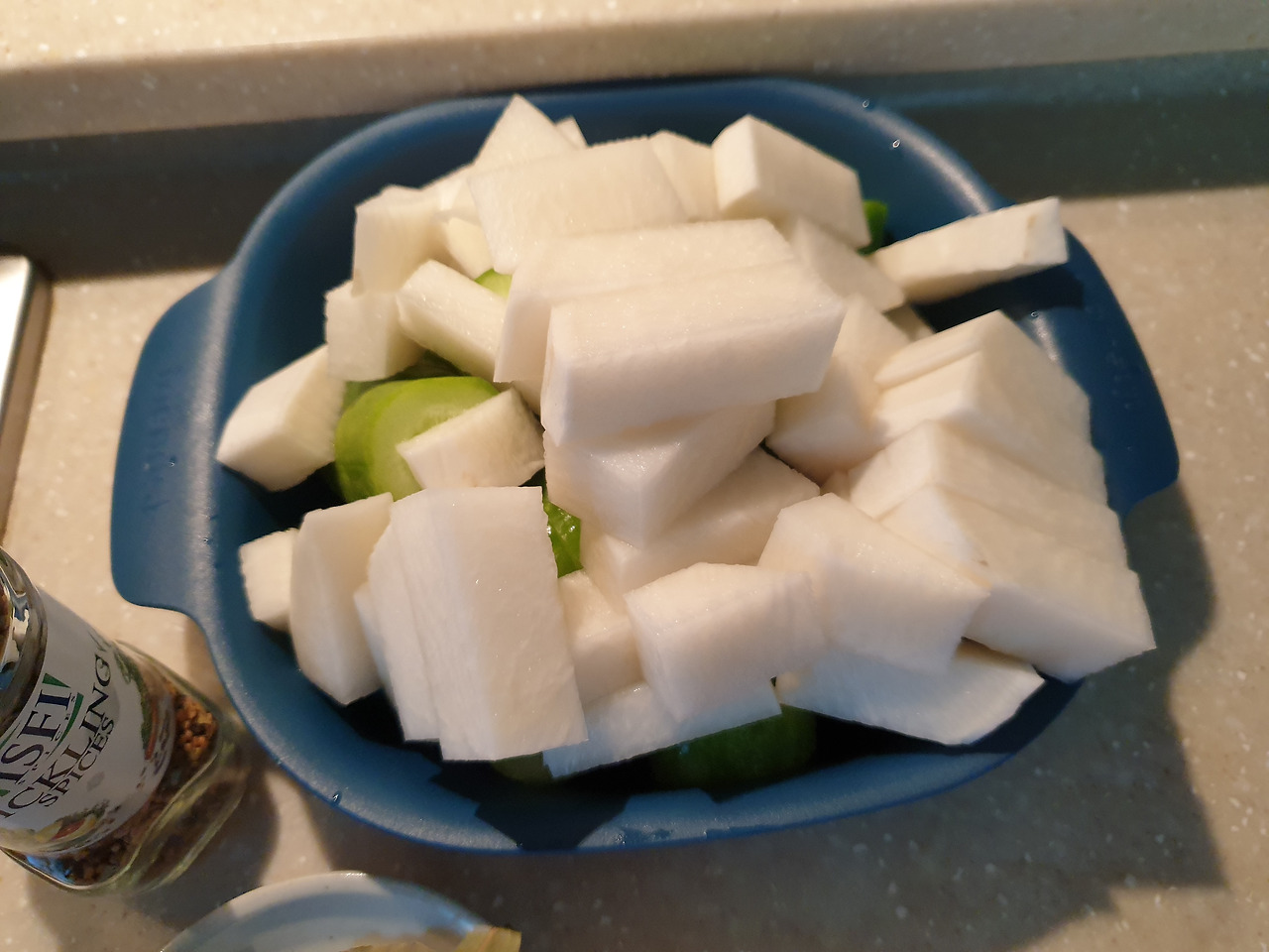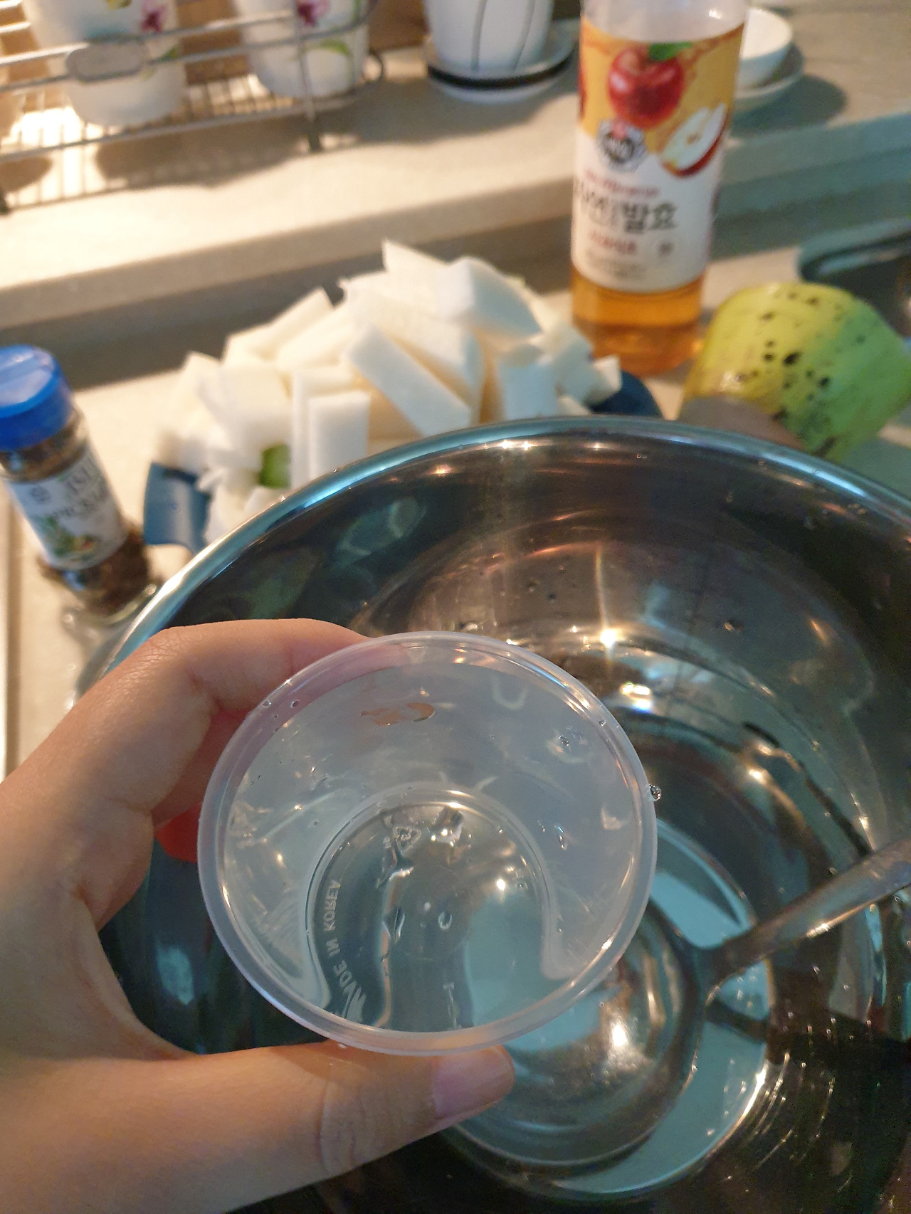 뜨거운 단촛물을 부었다. 꼭 뜨거운 걸 부어야 한다. 그래야 아삭해진다던데.