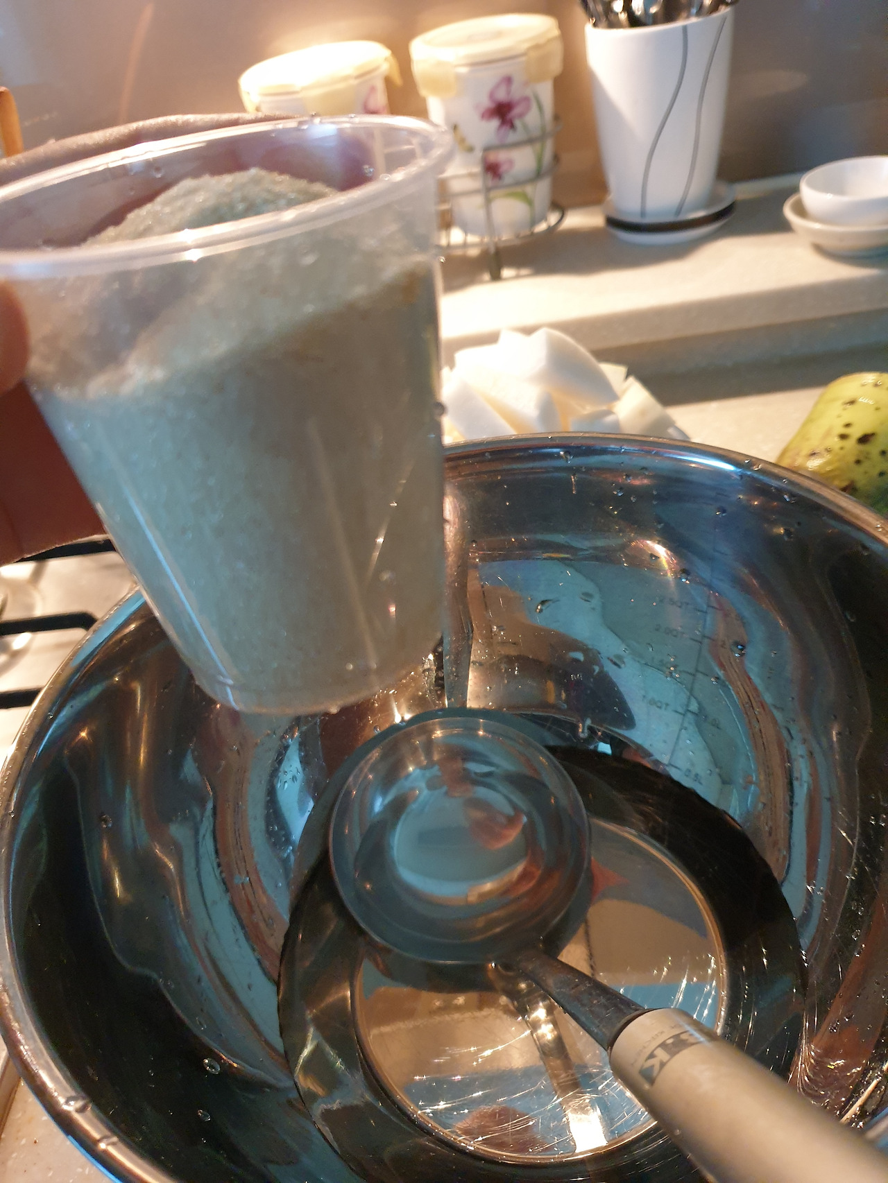 물 4컵을 냄비에 투하. 정확한 계량을 위해 컵을 사용했다. 어떻게든 정확하게 하고 싶어서 국자까지 꺼낸 모습.