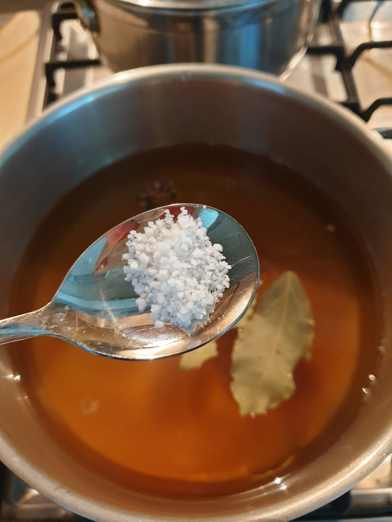 월계수 잎 2장과 피클링 스파이스 넣기. 얼마나 넣어야 될지 몰라서 소심하게 넣어 봤다. 누구는 반 스푼 넣으라 그러고 누구는 한 스푼 넣으라 그러고. 요리 초보자는 눈치보다 3분의 2를 넣었다.