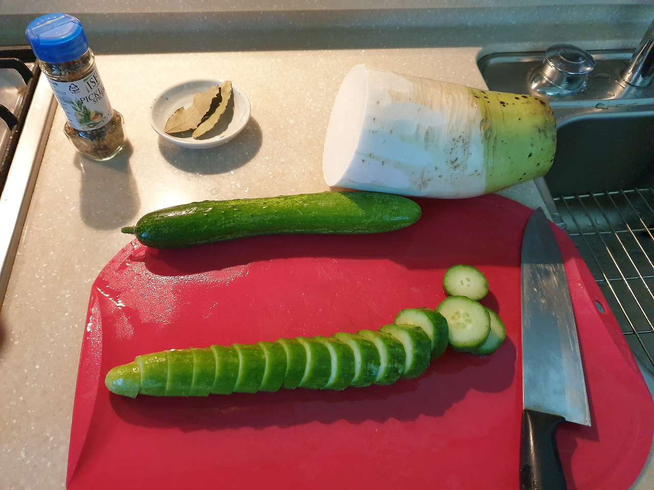 오이를 썬다. 식감을 위해 조금 두껍게 썰었다. 물결 모양 칼이 있으면 그걸로 썰면 좋을 것 같다. 없으니 패스-