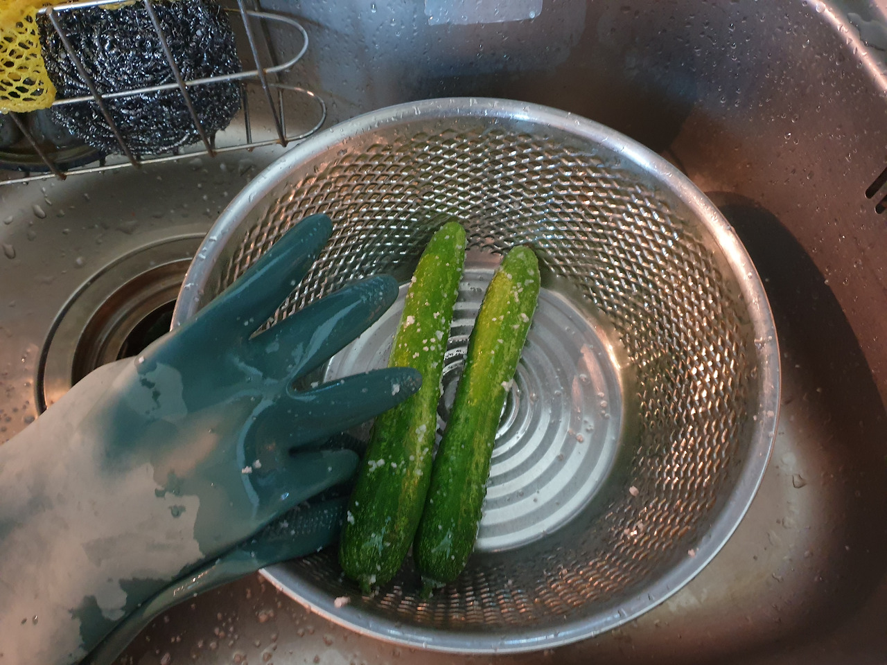 오이를 굵은소금으로 벅벅 문질러 닦는다. 맨손으로 하면 거친 소금에 다칠 수도 있으니 고무장갑을 끼고 했다. 난 초보자라 이렇게 했지만 숙련자들은 맨손에 후루룩! 닦고 말듯.