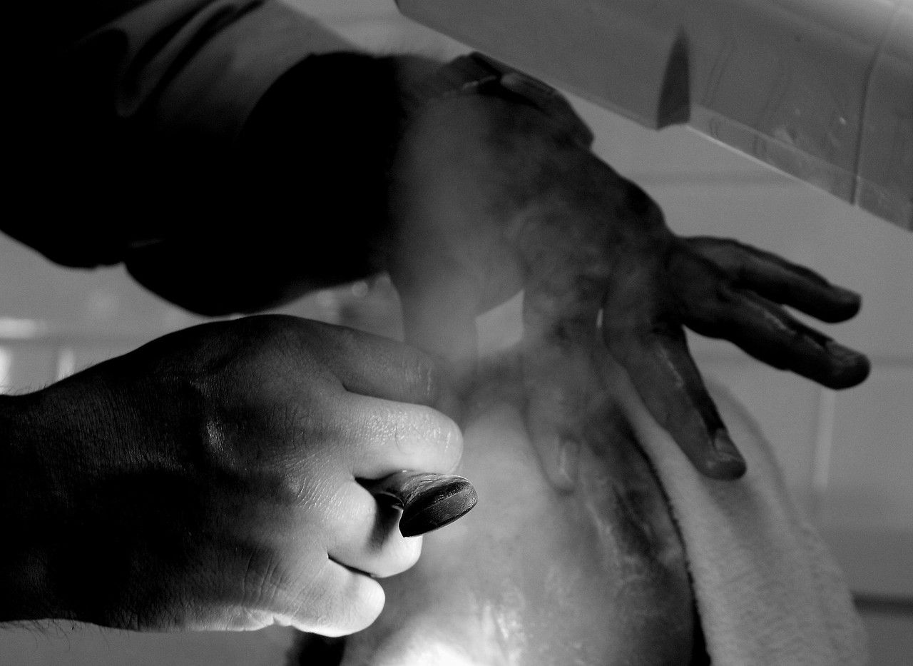 빨가벗긴 머리 위로 물 조루가 춤춘다
