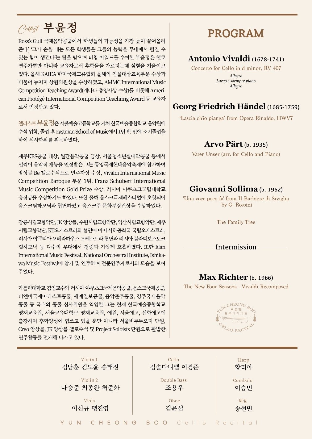 Vivaldi, Hendel, Part, Sollima, Richter의 다양한 레파토리로 Vivaldi의 바로크 음악을 시작으로 Vivaldi의 사계를 현대적으로 훌륭히 재해석한 Richer의 <The New Four Seasons> 으로 마무리 되는 연주회는 아주 훌륭했다. 엔드 핀을 타고 밀려오는 부윤정의 단단하고 깊이있는 첼로 소리와 앙상블의 조화는 놀라웠다. 다양한 악기 소리와 브렌딩되는 부윤정의 퀄리티 높은 첼로 현의 떨림이 지금도 가슴 속을 휘젓고 있다. 특히 Sollima의 세비야의 이발사 1막 5장(로시니) 편곡은 파격적이고 아주 놀라운 해석이었다. 부윤정과 젊은 음악가들의 역량은 대단하였다. 앵콜곡 넬라 판타지아가 아직도 황홀하게 귓가를 간질이고 있다.