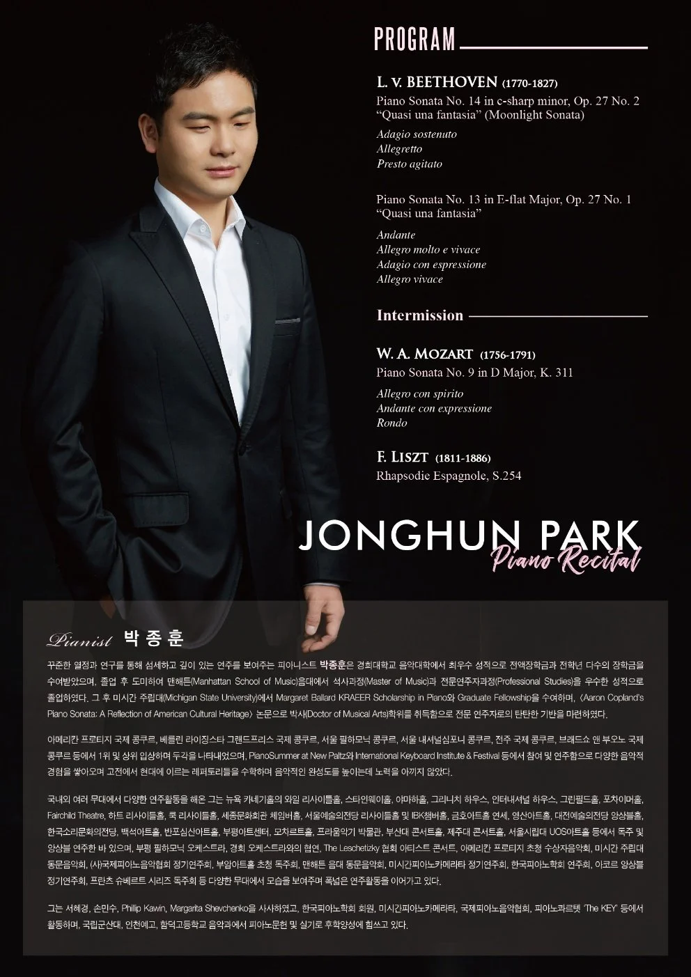 2023년 8월 9일(화) 7:30pm 여의도 영산아트홀에서 《박종훈 피아노 독주회》가 열렸다. 레퍼토리는 베토벤, 모짜르트, 리스트의 익숙한 곡들로 구성하였다.