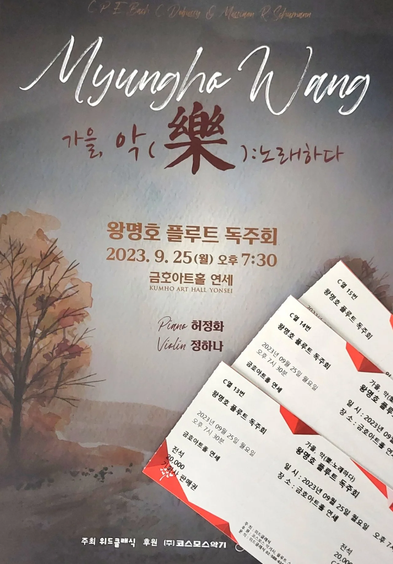 매력적인 음색을 가진 플루티스트 왕명호와 피아니스트 허정화, 바이올리니스트 정하나와의 하모니는화려한 가을날을 꿈꾸듯 풍성한 선율로 형용하기 어려운 아름다운 무대를 만들었다. 특히 C열 13번 VIP석에 앉아 플루티스트의 현란한 손가락의 움직임을 직관하면서 손가락과 플루트 키와의 오묘한 함수관계를 생각했다.